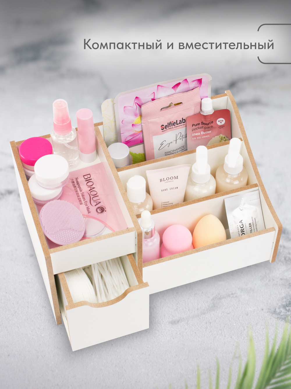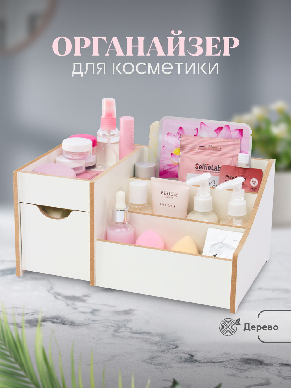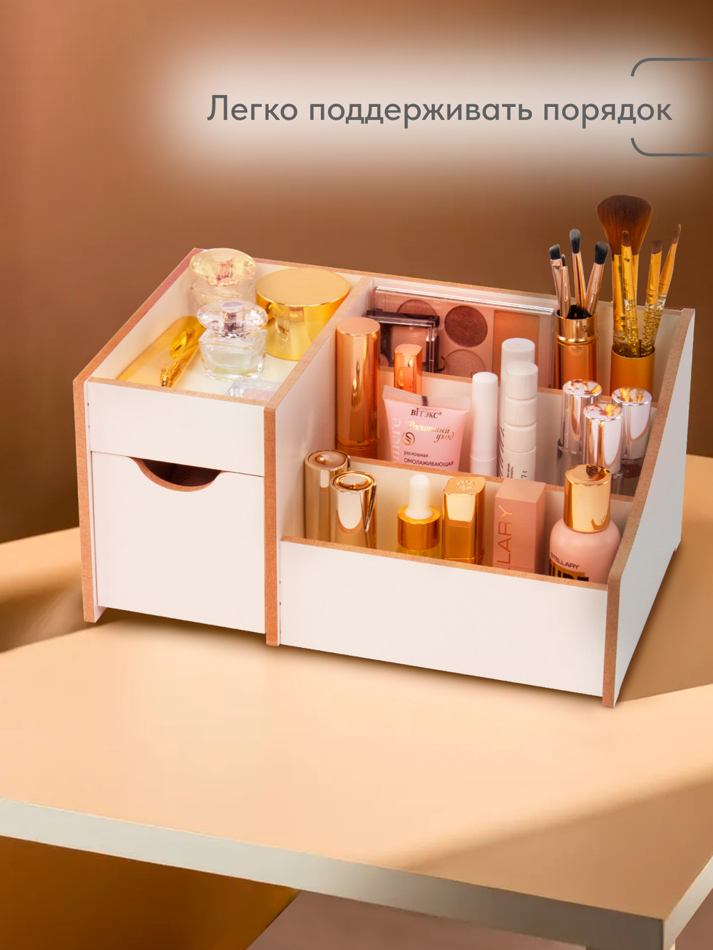 Органайзер для косметики настольный белый – идеальное решение для хранения кремов, духов, масок для лица, лаков для ногтей, помад и карандашей, декоративной косметики, расчесок, резинок, заколок. Можно использовать деревянный органайзер для комплексного ежедневного ухода за собой, ухода за волосами. А также можно превратить его в домашний салон для маникюра и педикюра, используя органайзер для лаков для ногтей и маникюрных принадлежностей.