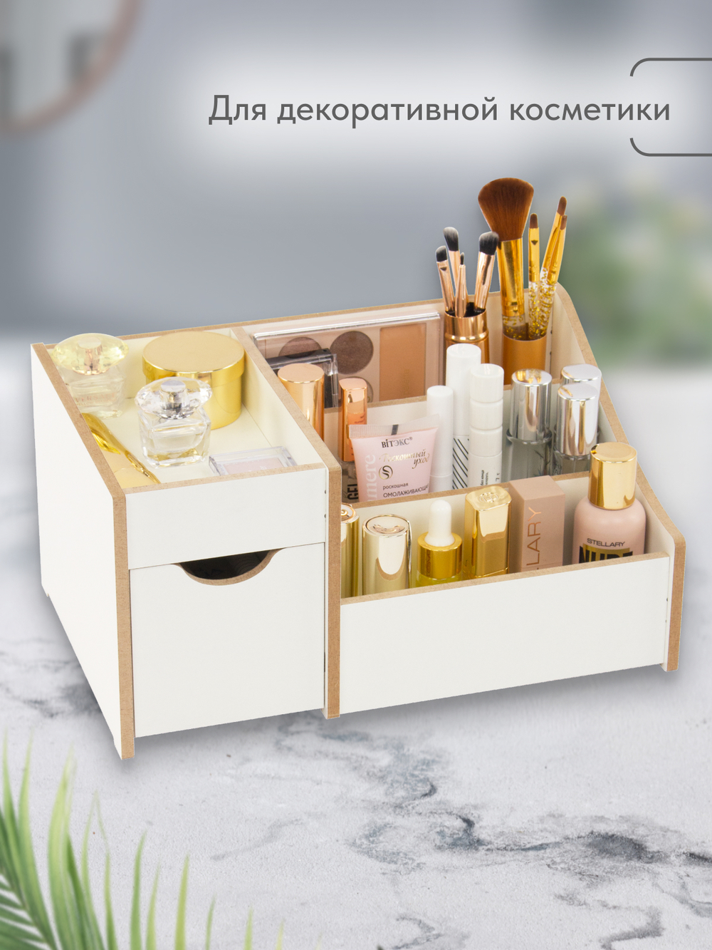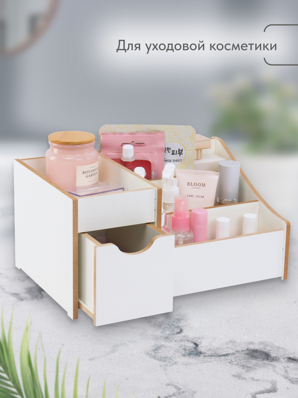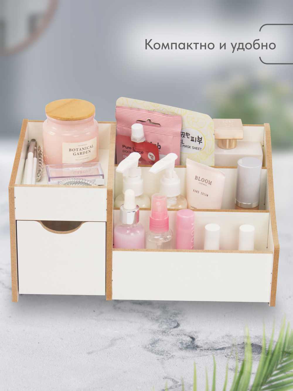 Органайзер для косметики настольный белый – идеальное решение для хранения кремов, духов, масок для лица, лаков для ногтей, помад и карандашей, декоративной косметики, расчесок, резинок, заколок. Можно использовать деревянный органайзер для комплексного ежедневного ухода за собой, ухода за волосами. А также можно превратить его в домашний салон для маникюра и педикюра, используя органайзер для лаков для ногтей и маникюрных принадлежностей.