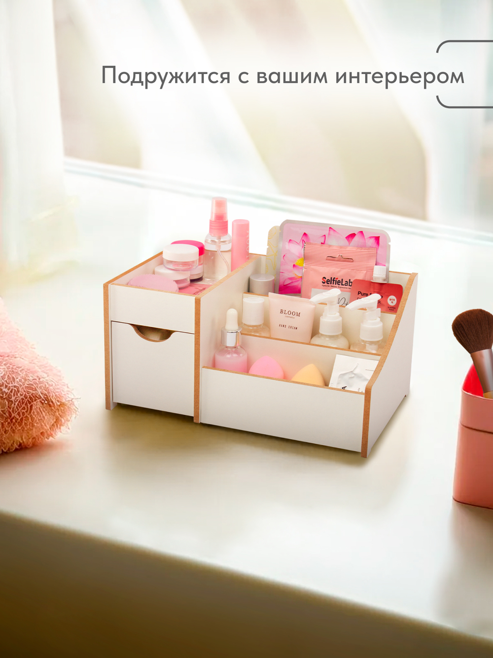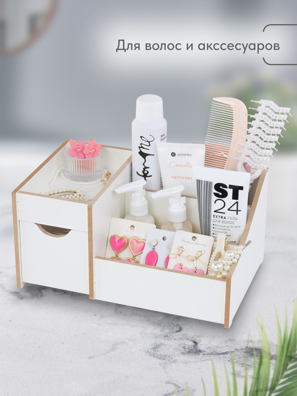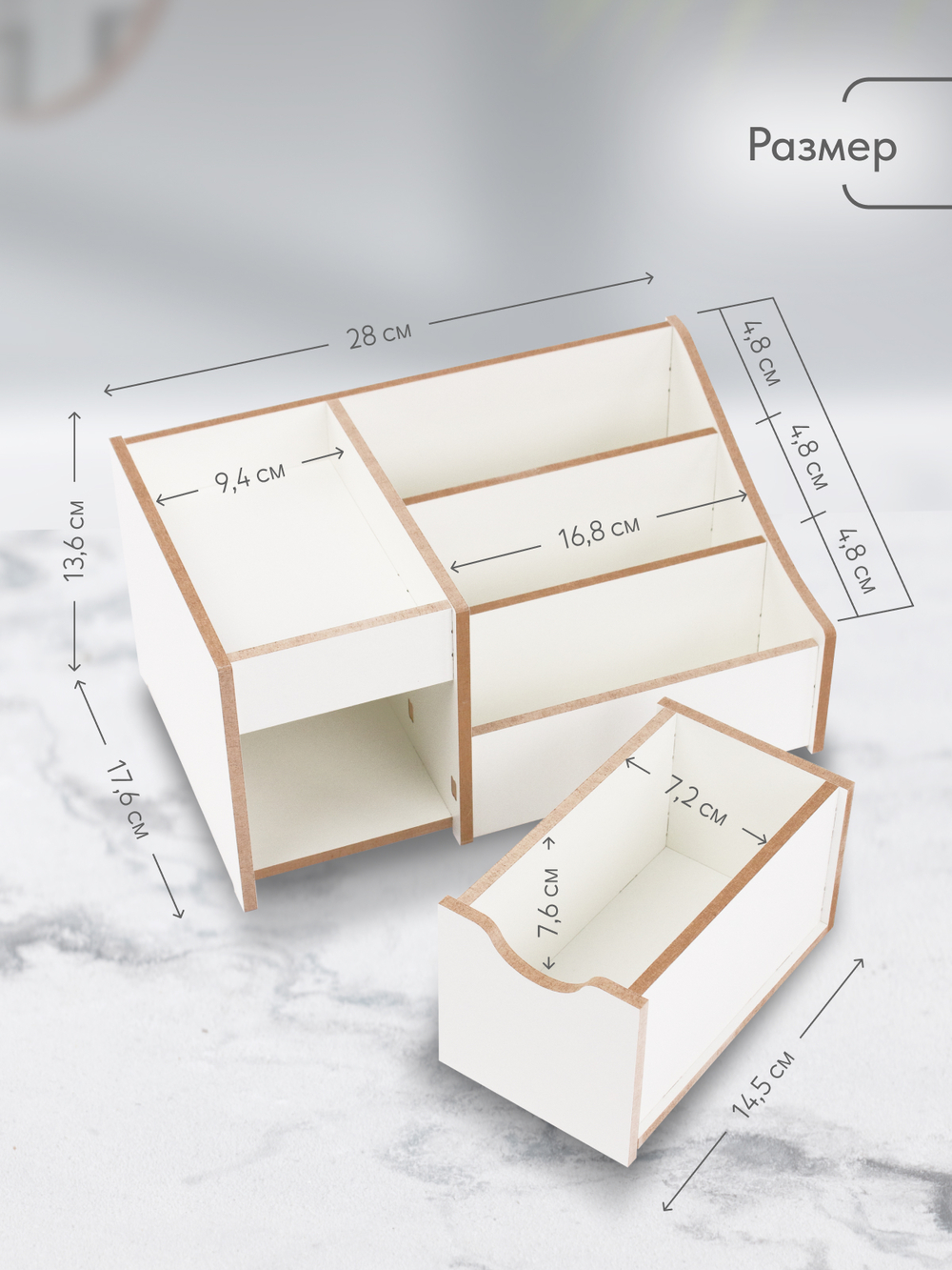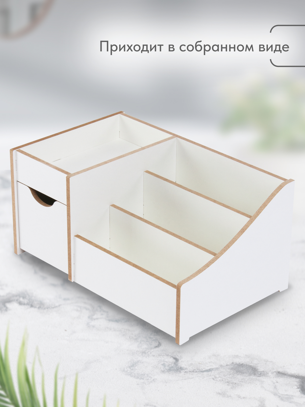 Органайзер для косметики настольный большой выполнен в белом цвете из прочного МДФ, гладкий на ощупь, лёгкий в уходе, стильный, хорошо смотрится в любом интерьере. Большой и вместительный органайзер для косметики настольный с ящиком в комплекте решает многие задачи по красивому оформлению пространства. В вертикальных секциях удобно расставить кремы, маски для лица, расчёски, а в выдвижном ящике удобно спрятать женские штучки, ежедневные прокладки, заколки, резинки и другие мелочи.