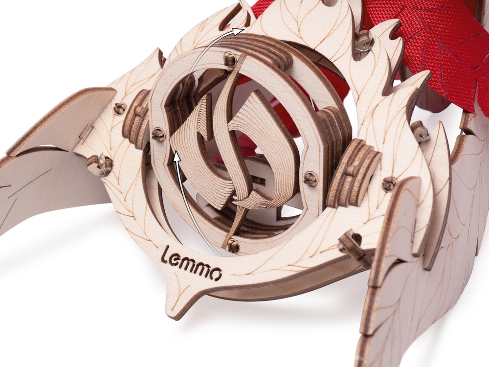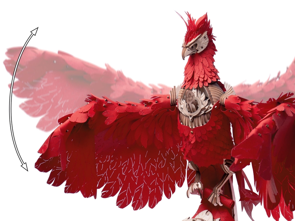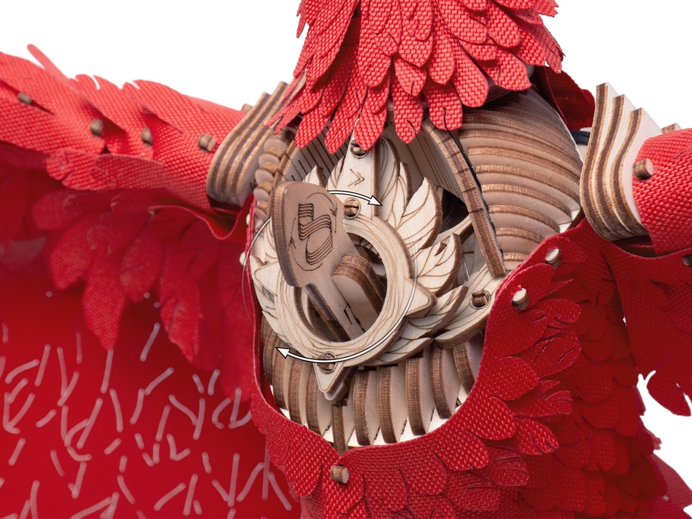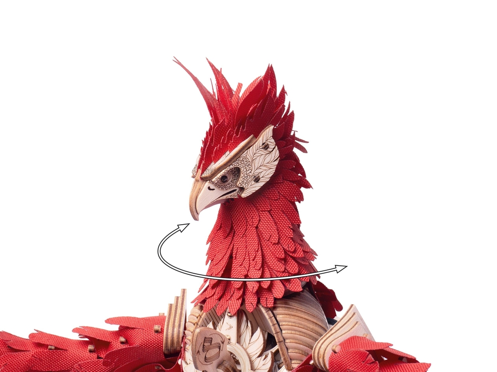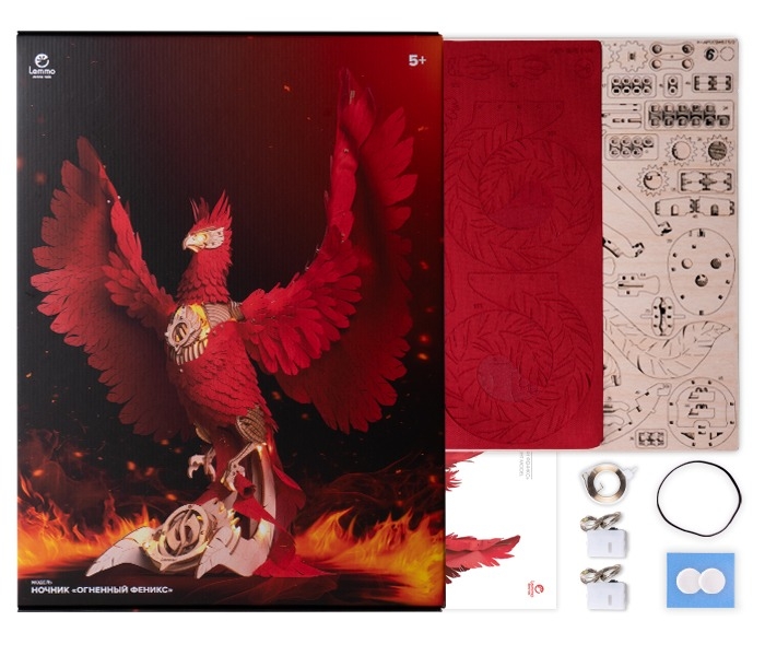 После сборки феникс оживает: его голова поворачивается и наклоняется, а крылья на пружинном механизме совершают от 10 до 16 взмахов. Мягкая светодиодная подсветка превращает модель в уютный ночник и стильный элемент интерьера.