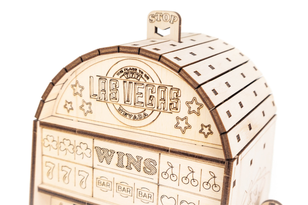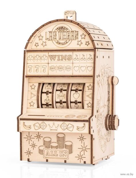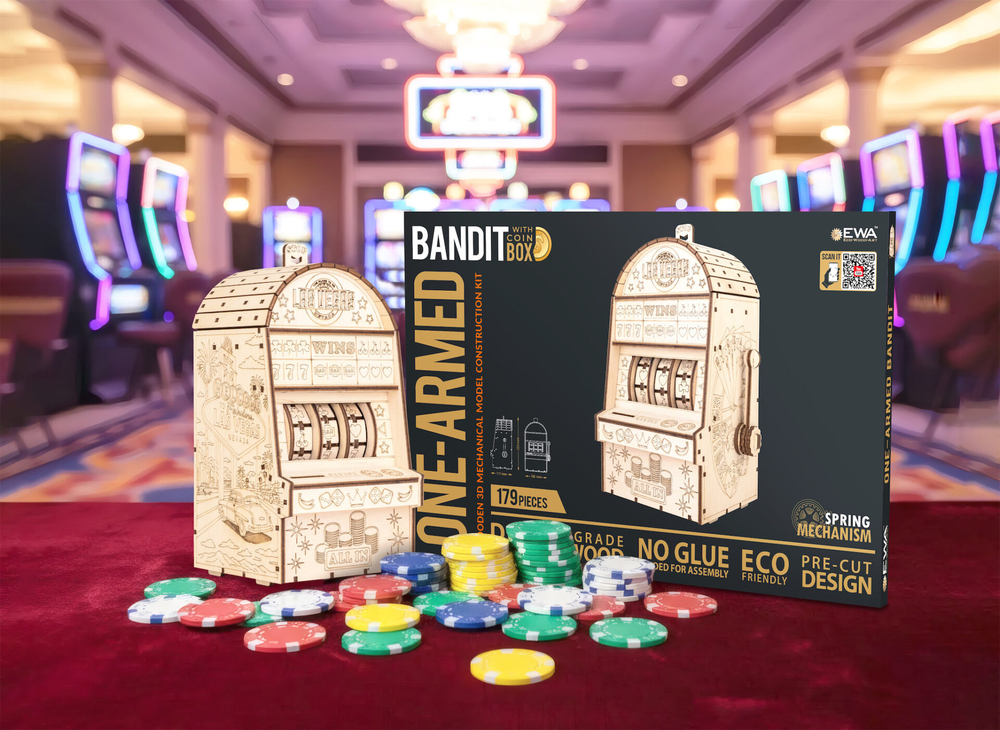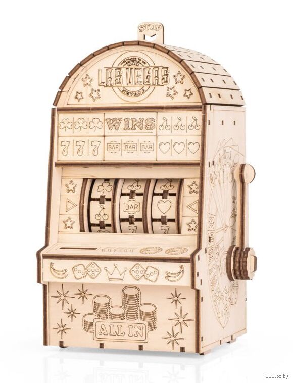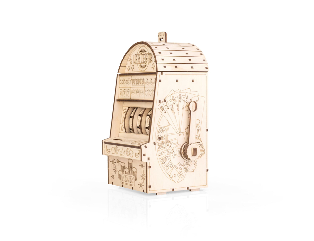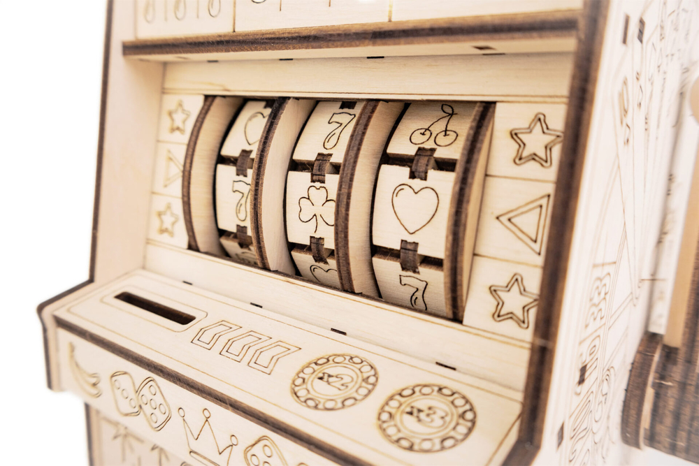 Деревянный механический конструктор "Однорукий бандит" – это оригинальная модель игрового автомата с подвижной механикой. После сборки вы опускаете рычаг, забрасываете монетки, и барабаны начинают вращаться – остаётся дождаться выигрышной комбинации из трёх символов.