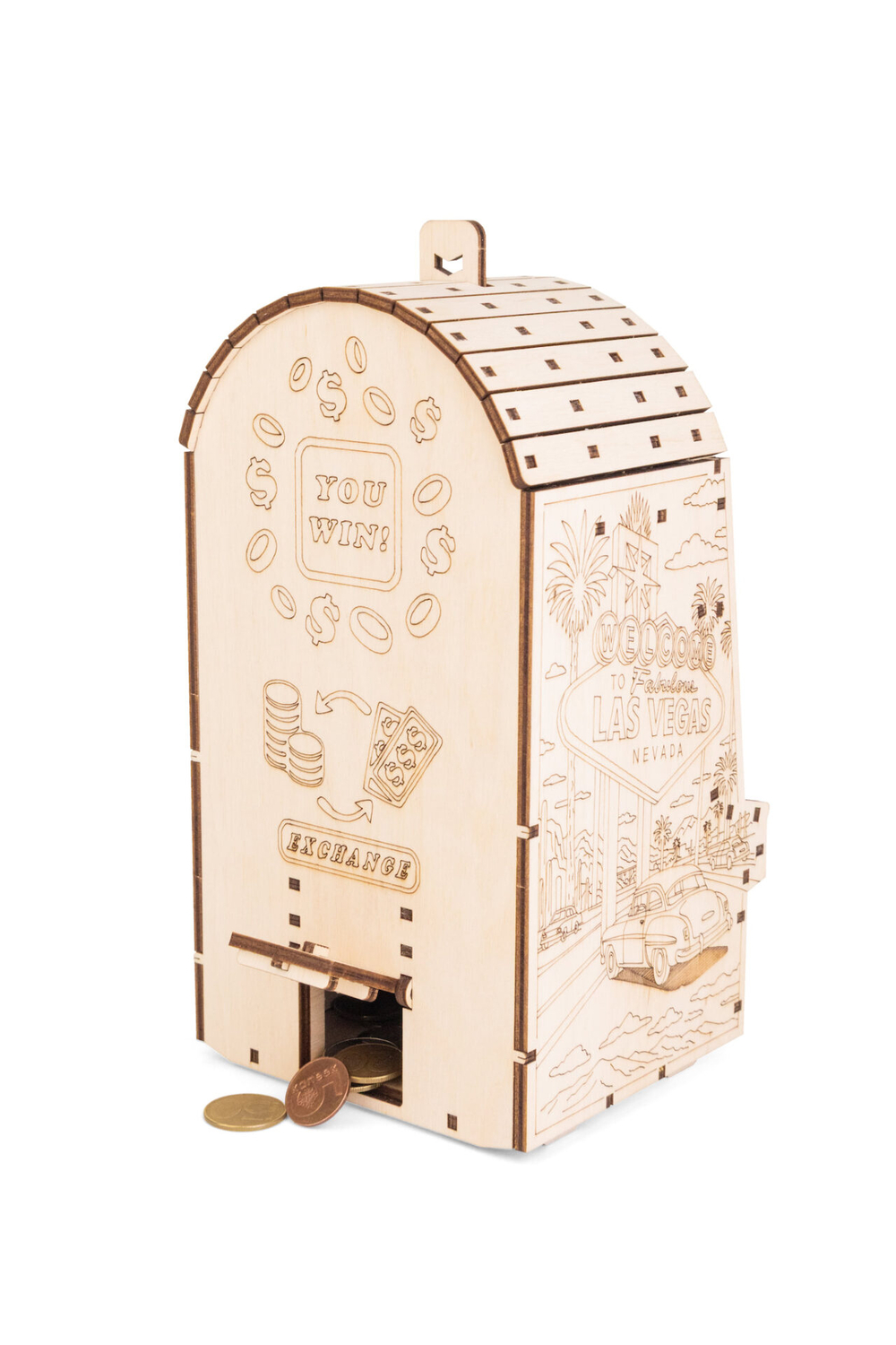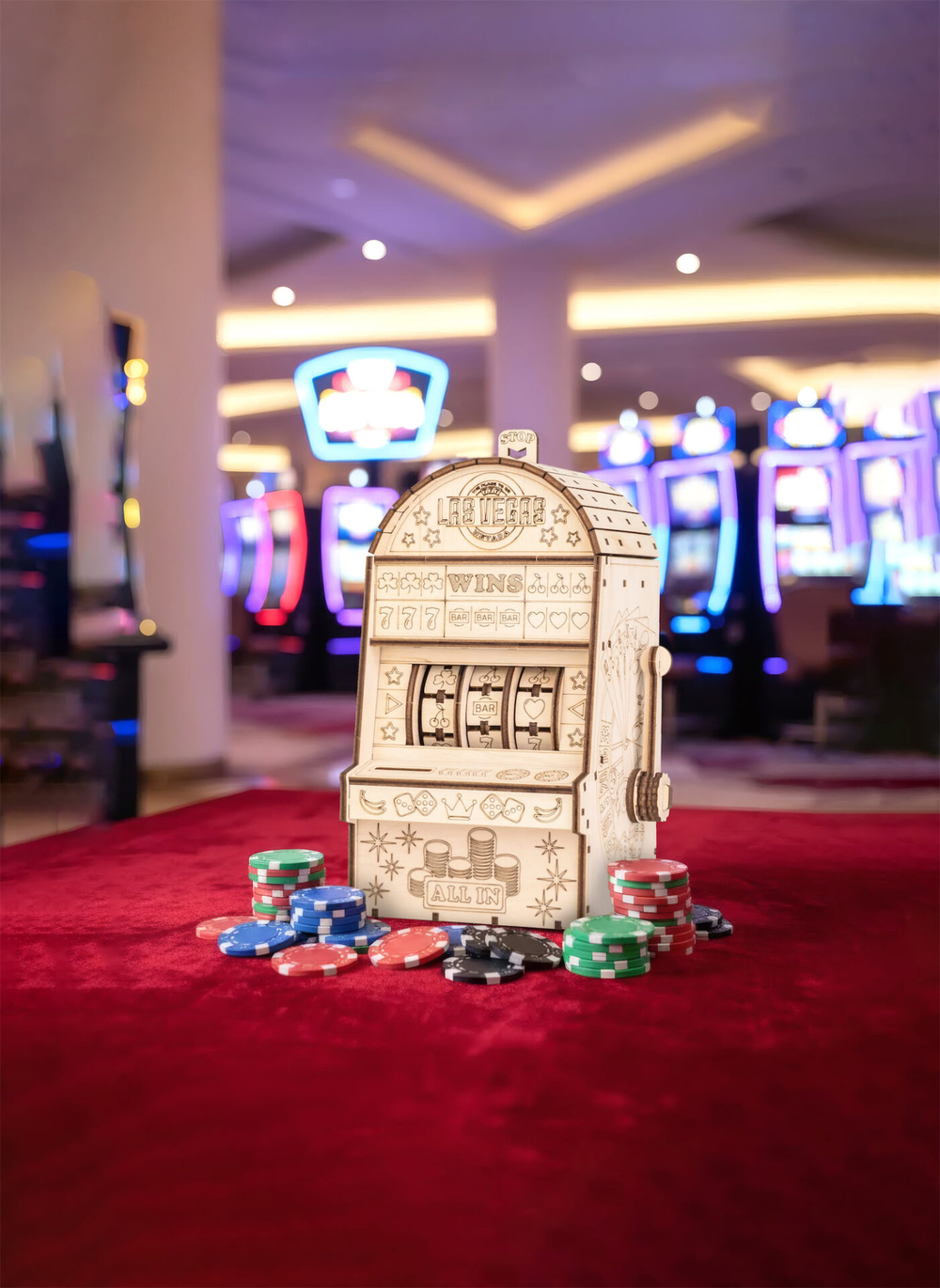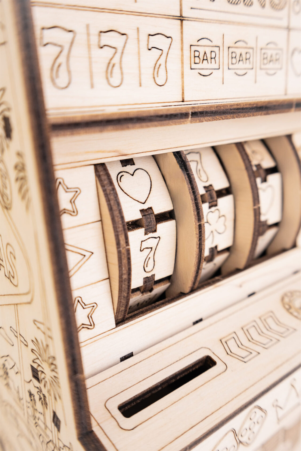 Деревянный механический конструктор "Однорукий бандит" – это оригинальная модель игрового автомата с подвижной механикой. После сборки вы опускаете рычаг, забрасываете монетки, и барабаны начинают вращаться – остаётся дождаться выигрышной комбинации из трёх символов.