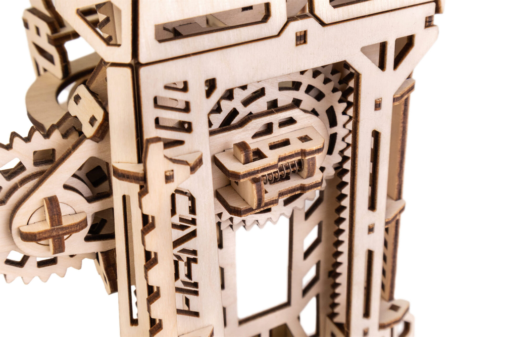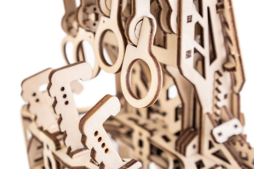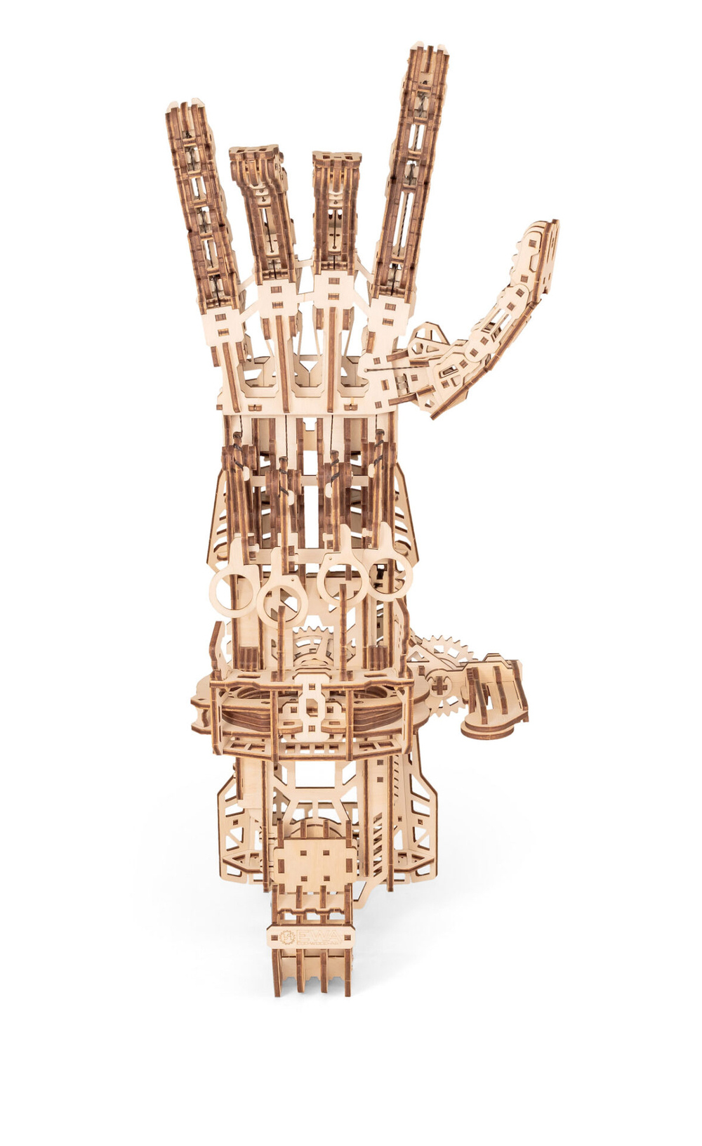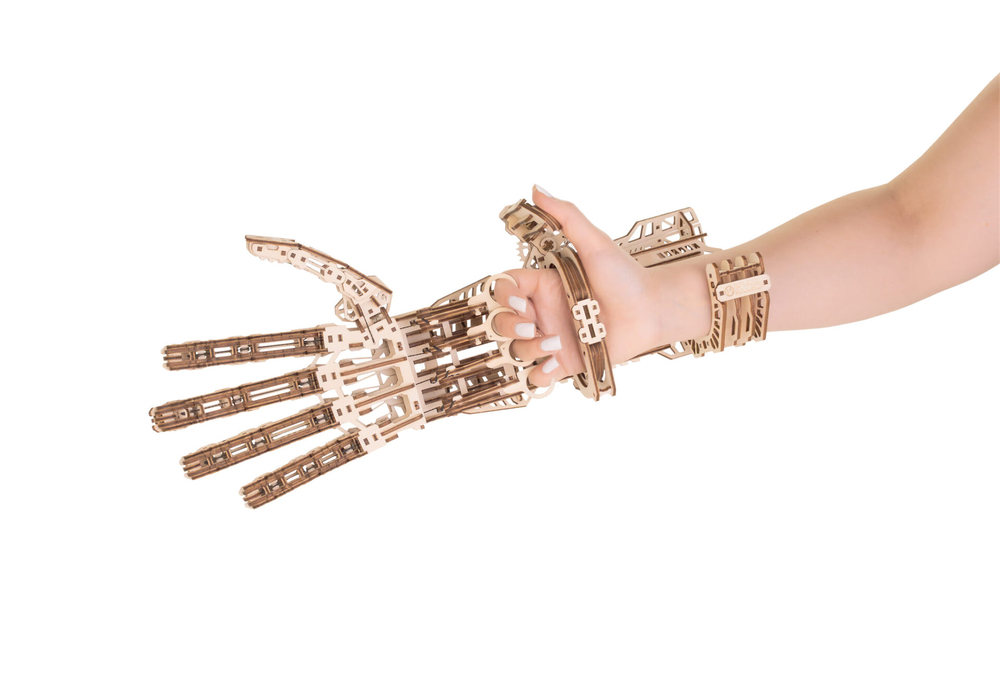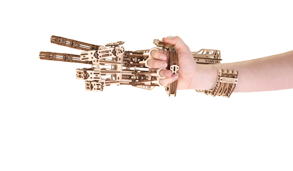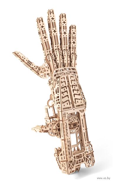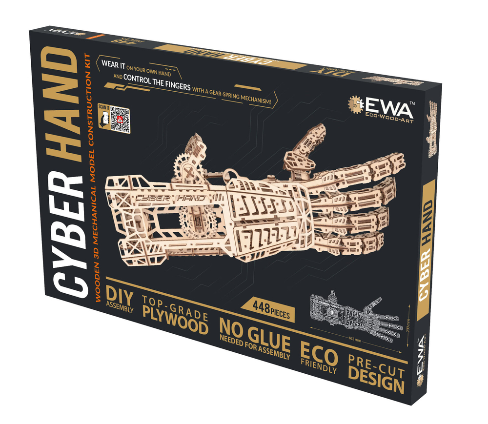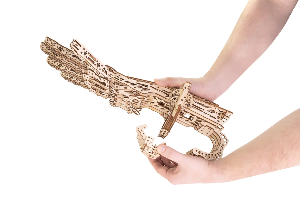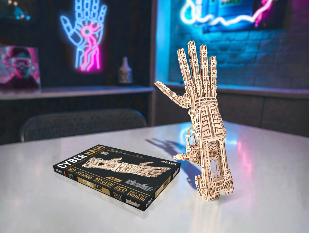 Кибер рука – деревянный механический конструктор для тех, кто любит сложные, продуманные и эффектные модели. Это одна из самых непростых сборок в линейке: 448 деталей, точная подгонка элементов и металлические пружины внутри, которые приводят механизм в движение.