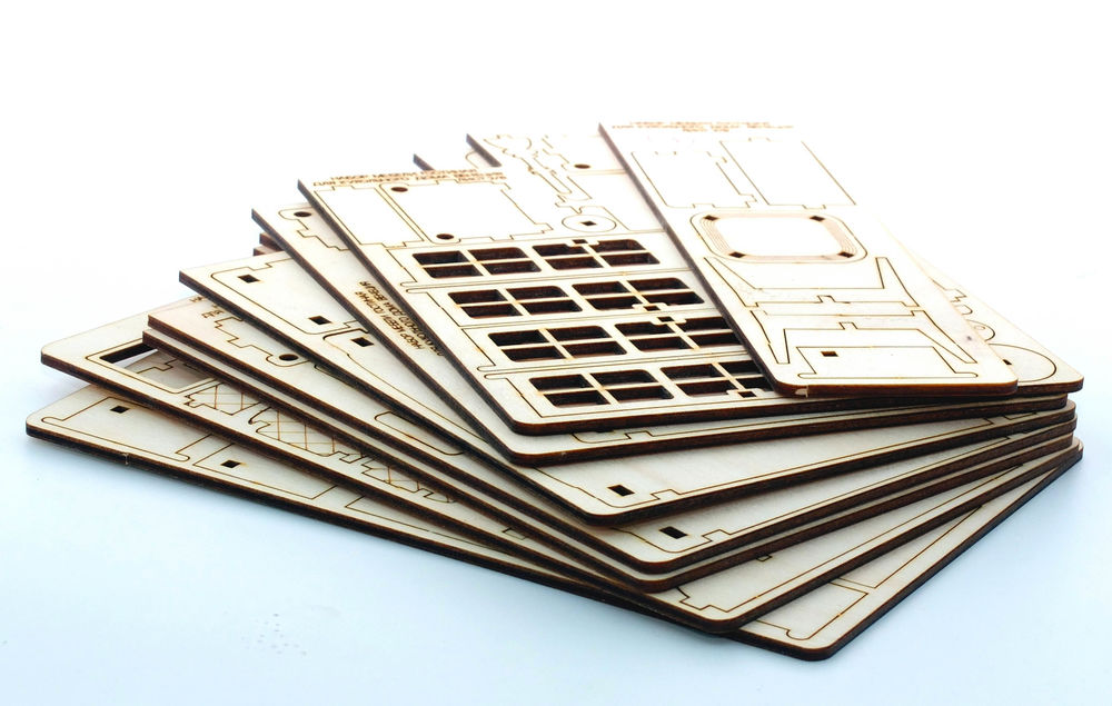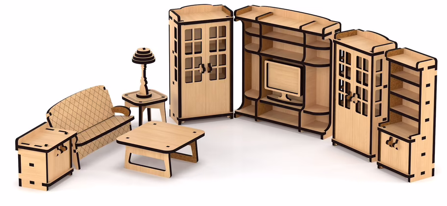 Мебель выполнена из березовой фанеры, даже небольшие элементы, такие как ручки на дверцах. Все детали собираются с небольшим количеством клея, просто вставляются в пазы, крепление очень прочное и надежное.