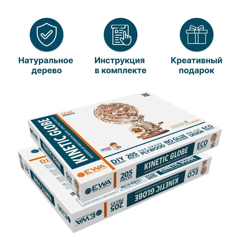 Искусно выполненный экологичный резиномотор, дополненный механизмом запуска и остановки, приводит в движение полупрозрачную сферу и множество шестеренок, которые в совокупности символизируют силу Земли, природы, энергии и механики. Модель предназначена для самостоятельной сборки без клея и доставит массу удовольствия как детям, так и взрослым.