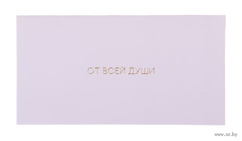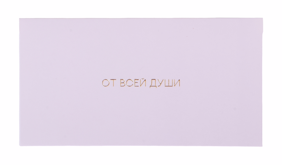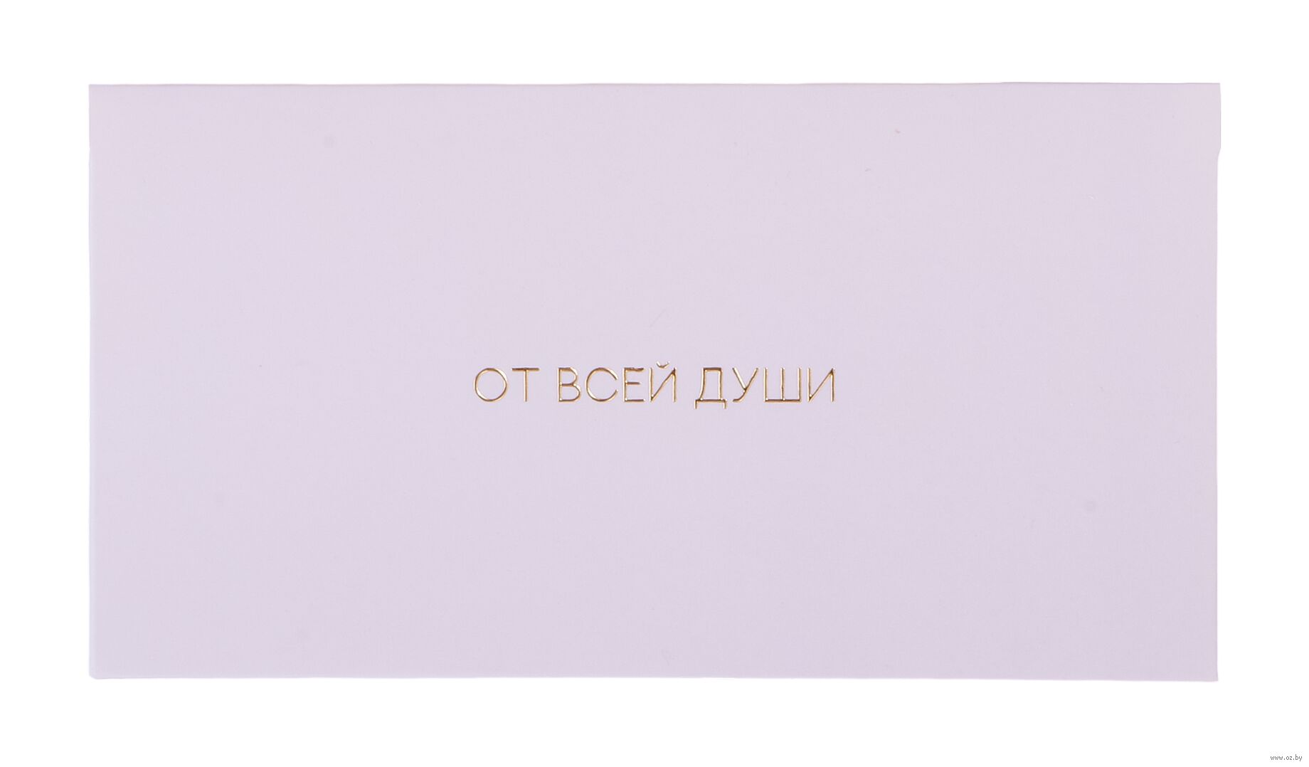 Тиснение универсальной надписи "От всей души" выполнено золотой фольгой. Она делает конверт необычайно красивым. Нежные оттенки подойдут для любого праздника.