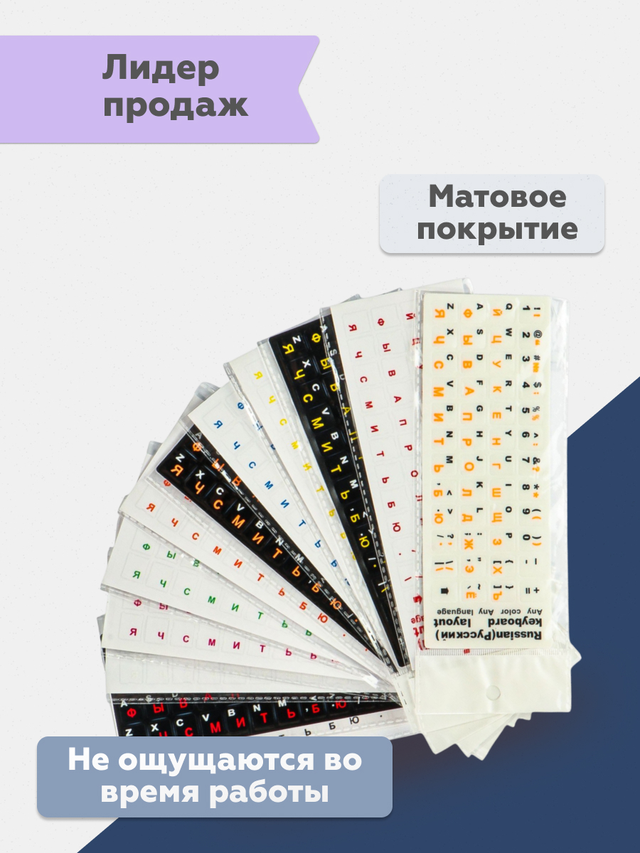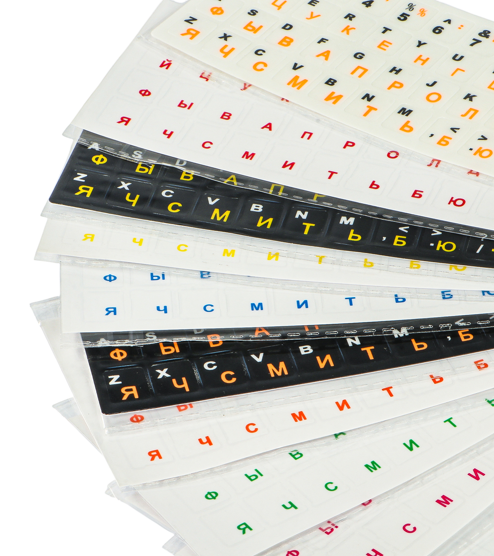Универсальные наклейки на клавиатуру – это простой и эффективный способ обновить свой гаджет. Наклейки для клавиатуры содержат русскую и латинскую раскладку. Наклейки на ноутбук ввиде клавиш продлевают их срок службы, позволяют легко заменить стёртые от времени обозначения, а также защищают от царапин и пятен. Изготовлены из поликарбоната: качественного и износостойкого материала. Основание наклеек выполнено из самоклеящейся виниловой пленки. Наклейки прослужат вам много лет, так как дополнительно защищены прочным ламинированным слоем.