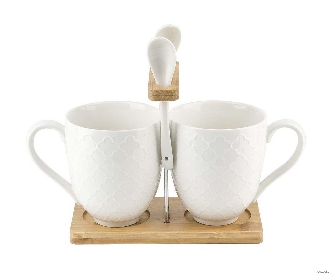 Набор кружек на деревянной подставке с ложками прекрасный пример высококачественной, удобной и лаконичной посуды для изящной сервировки стола.