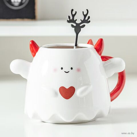 Кружка "Влюблённый чертёнок". Озорной керамический набор с ложкой – для тех, кто любит пить чай с характером!