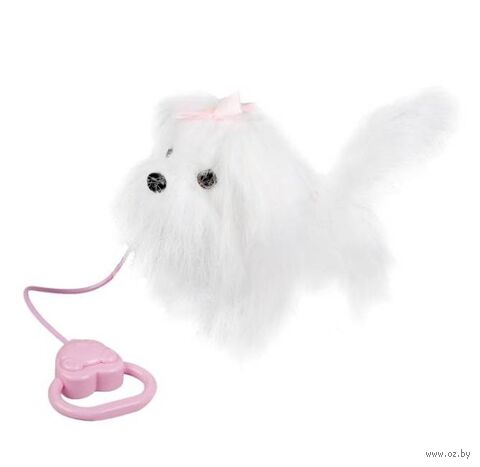 Ребёнок будет рад этому очаровательному щенку с длинной пушистой шёрсткой белого цвета и симпатичным розовым бантиком на голове. Милая игрушка подарит малышу массу положительных эмоций и научит заботиться о домашнем любимице.