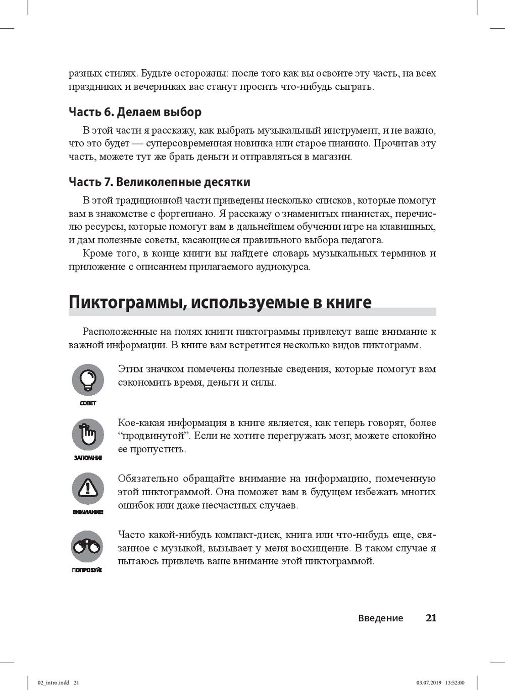 В книге простым и понятным языком объясняются основы музыкальной теории и азы нотной записи для фортепиано. Вы научитесь свободно играть правой и левой рукой, освоите гаммы и аккорды и узнаете, как играть в различных музыкальных стилях!