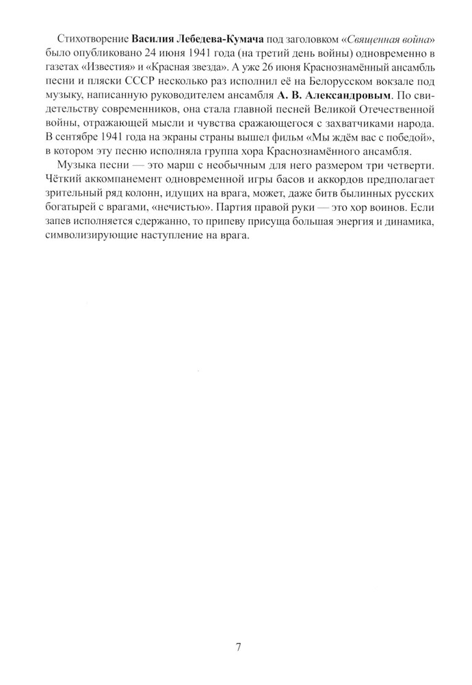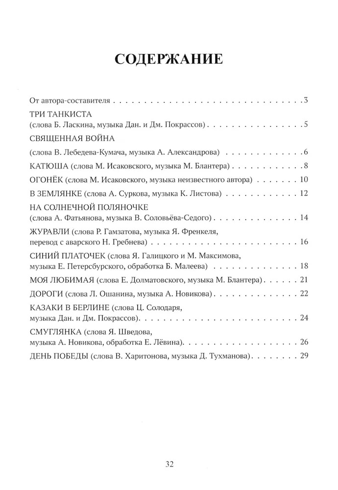 В сборник вошли песни времён Великой Отечественной войны и о войне. Они звучали на позициях и в тылу, по радио и в кинофильмах военных и послевоенных лет. Это произведения разных жанров: марши, танцы, лирические песни. Все они даны в удобном облегчённом изложении, снабжены методическими комментариями и рассчитаны на учеников 2-5 классов детских музыкальных школ, а также на всех любителей музыки.