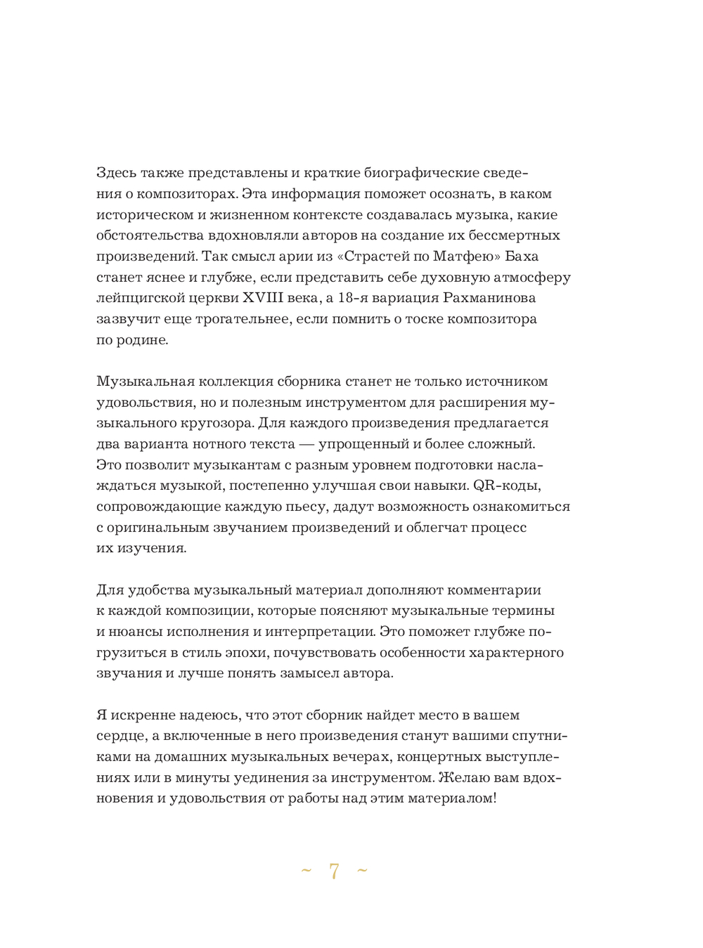 В книге объединены авторские переложения и аранжировки музыкальных шедевров и менее популярных произведений с культурологическими комментариями, чтобы ваши занятия за инструментом стали еще более осознанными и насыщенными. Вы познакомитесь с краткими биографиями композиторов, историческим контекстом создания каждого сочинения, музыкальным анализом произведений и исполнительскими нюансами.