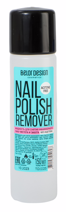 Смочите жидкостью ватный диск, прижмите его к ногтю, подержите некоторое время, чтобы лак пропитался. Проводите диском по направлению к кончику ногтя, слегка надавливая, чтобы полностью снять лак.Состав