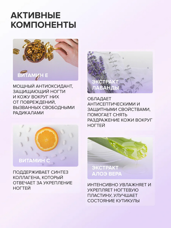 Жидкость для снятия лака "Лаванда-Алоэ" делает этот этап приятным и бережным. Она эффективно удаляет лак, не пересушивая ногти и кутикулу, а нежный лавандовый аромат превращает маникюр в приятный ритуал заботы о себе.
