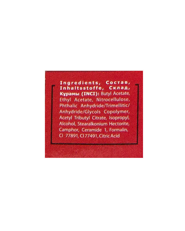 Butyl Acetate, Ethyl Acetate, Nitrocellulose, Phthalic Anhydride/Trimellitic Anhydride/Glycols Copolymer, Acetyl Tributyl Citrate, Isopropyl, Alcohol, Stearalkonium Hectorite, Camphor, Ceramide 1, Formalin, CI 77891, CI 77491, Citric Acid