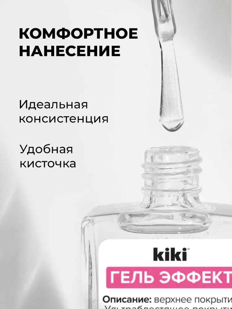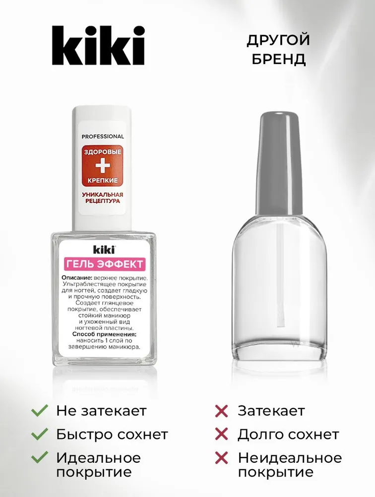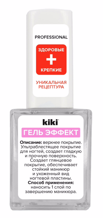 Укрепляющий лак для ногтей Kiki "Гель эффект" – верхнее топовое покрытие, защищающее ногтевую пластину, дарящее ее здоровый блеск, прочность и ухоженный вид.