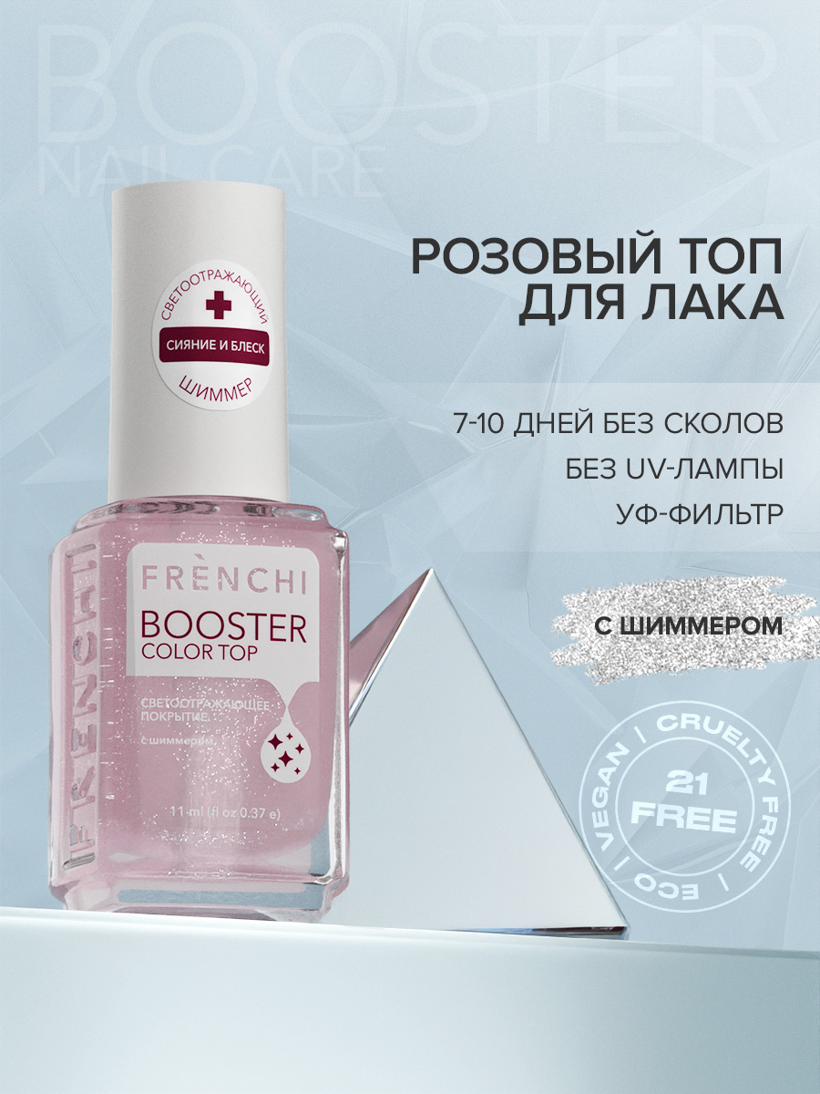 Розовое светоотражающее покрытие с шиммером идеальное решение для моментального обновления маникюра без смены цвета. Всего один слой топа поможет восстановить глянцевый финиш и усилить глубину оттенка, добавить нежное розовое сияние благодаря деликатному шимеру. Покрытие легко наносится без разводов, пузырей и подтеков, не требует сушки в лампе и высыхает за 2 минуты.