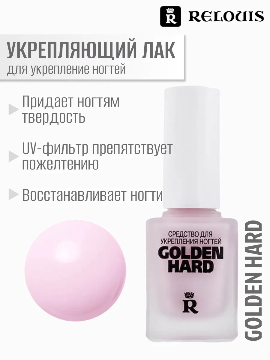 Новое укрепляющее и защитное средство от Relouis "Golden Hard" – продукт нового поколения. Уникальная формула средства создана на основе коллоидного золота. Оно не только укрепляет структуру ногтевой пластины, но также оказывает противовоспалительное действие.