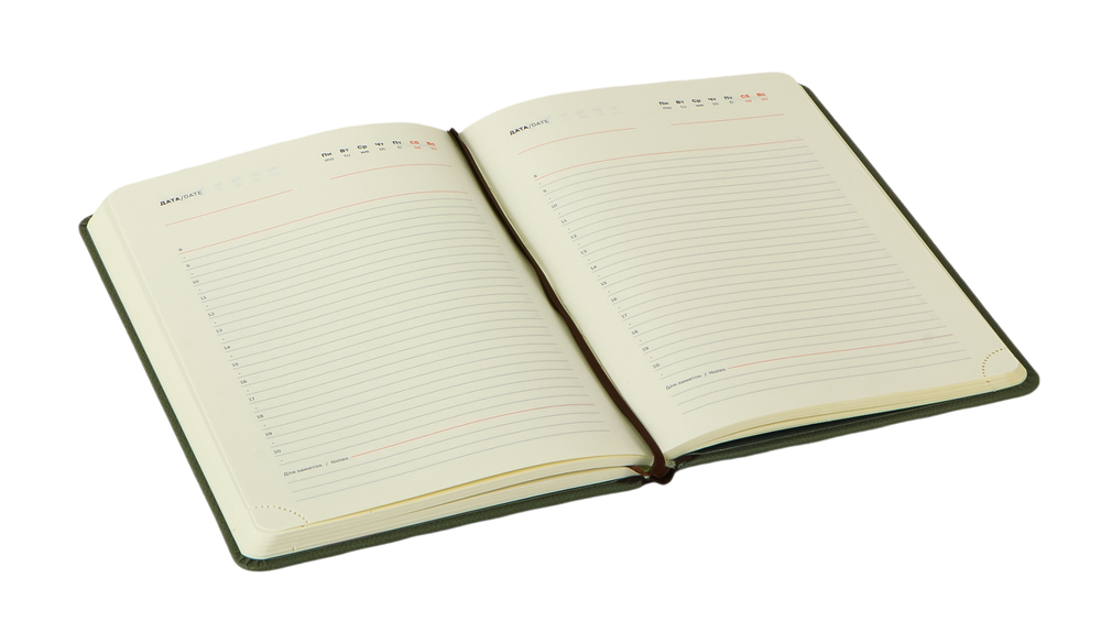 Две закладки-ляссе позволят быстро и легко найти нужную страницу, что делает навигацию по ежедневнику удобной и эффективной. Специальная петля из прочной резинки в цвет обложки подойдёт для фиксации ручек.