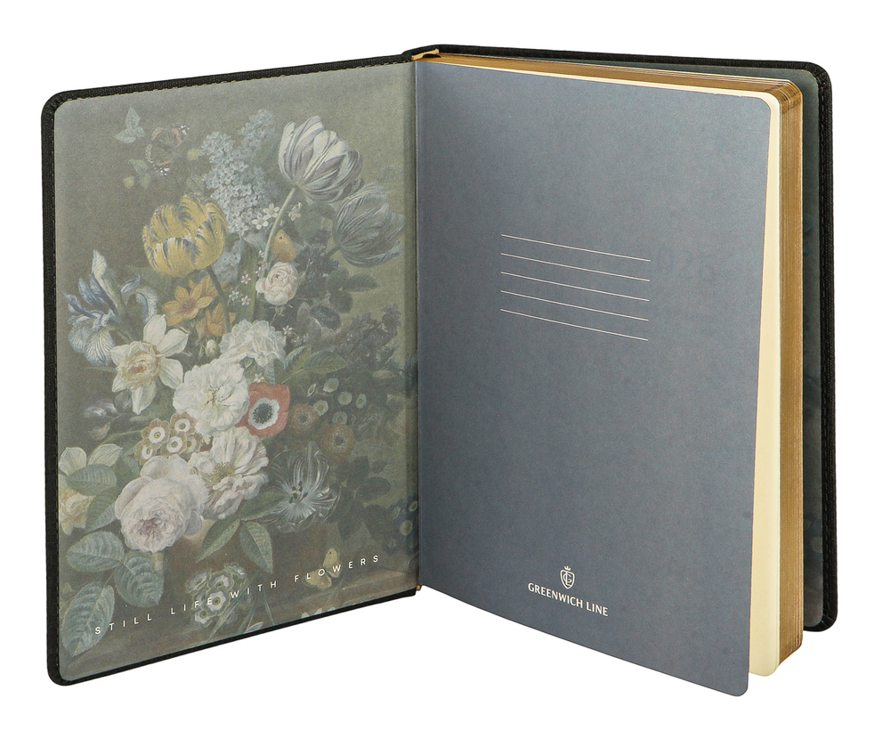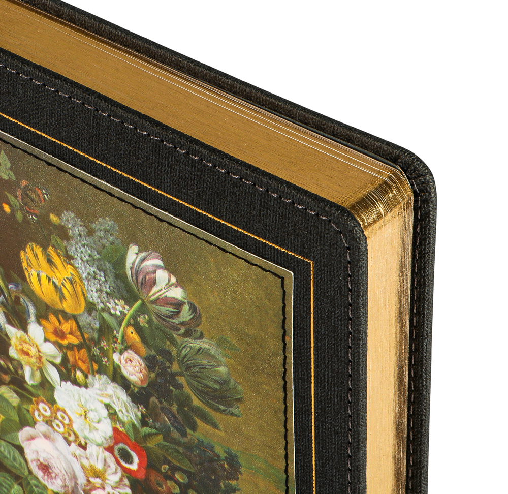 Обложка украшена картинами по мотивам известных художников. Золотой срез придает ежедневнику особый шарм.