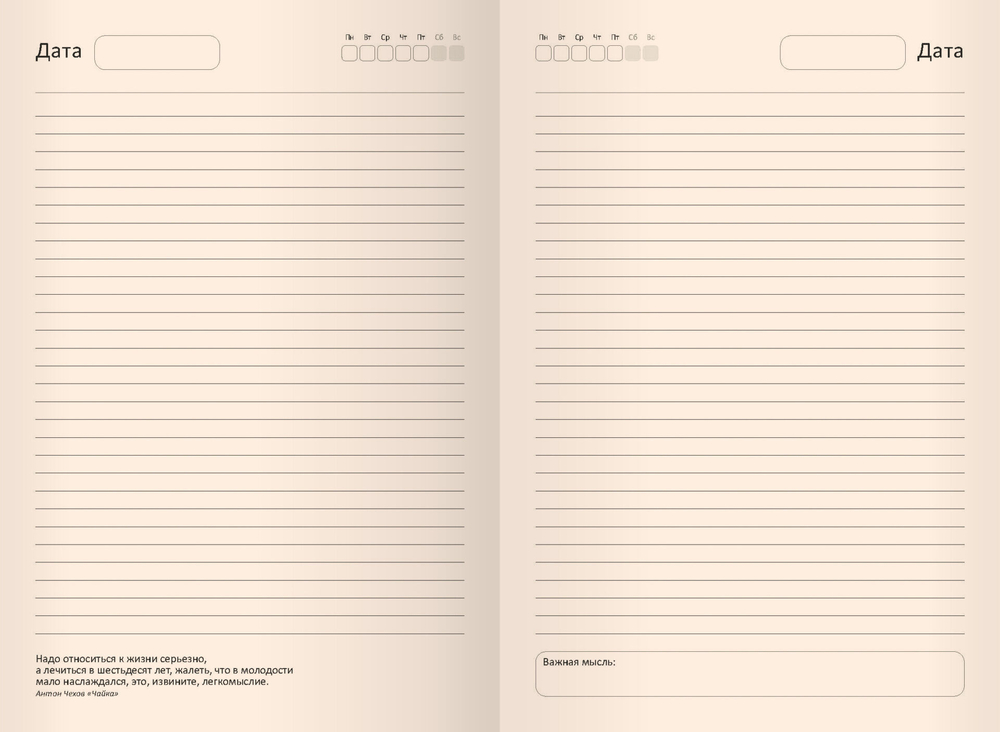 Тонированный внутренний блок позволяет аккуратно вести записи, планировать свой день и ставить новые цели. Кроме того, на страницах блока вы найдете мотивирующие цитаты известных авторов.