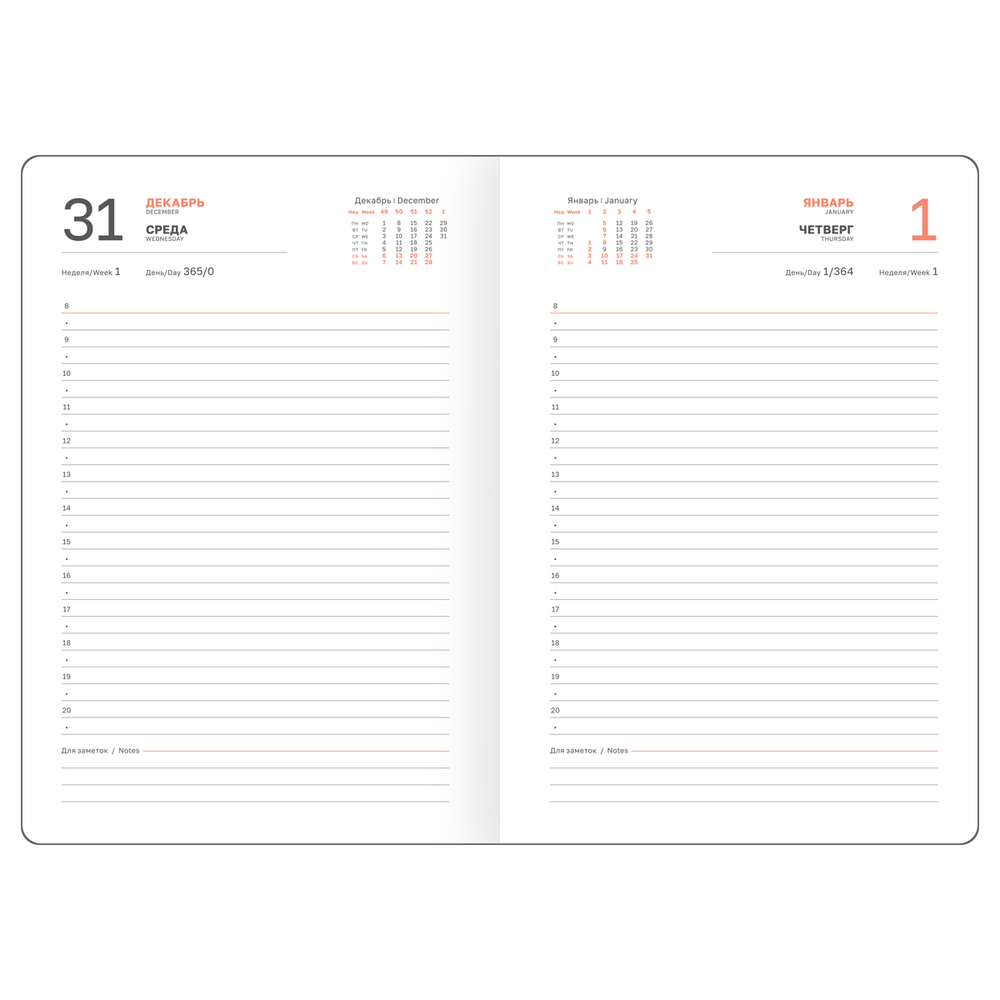 Изделие представлено в размере 145х205 мм. Внутренний блок состоит из 176 листов высококачественной белой бумаги повышенной плотности 70 г/м2 с пантонной печатью в 2 краски. Срез и резинка создают эффектный визуальный контраст с основным цветом обложки, делая ежедневник более привлекательным.