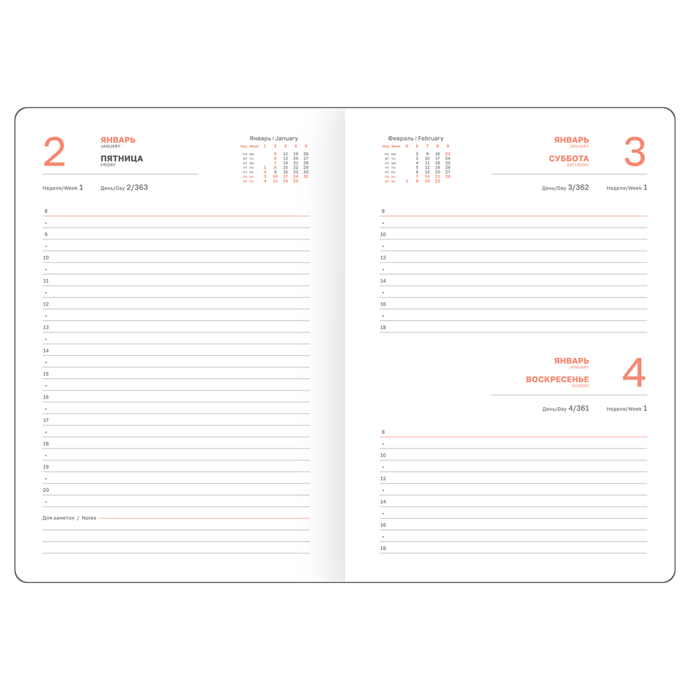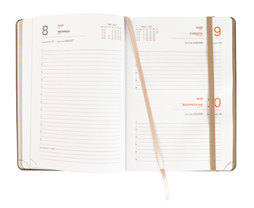 Перфорированные уголки и закладка-ляссе обеспечат комфорт и удобство при использовании. В ежедневнике предусмотрена справочная информация, ежемесячный планер, календарь и другие полезные сведения. Резинка не позволит ежедневнику неожиданно открыться.