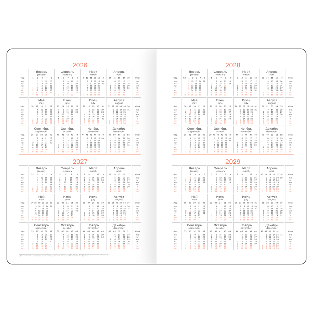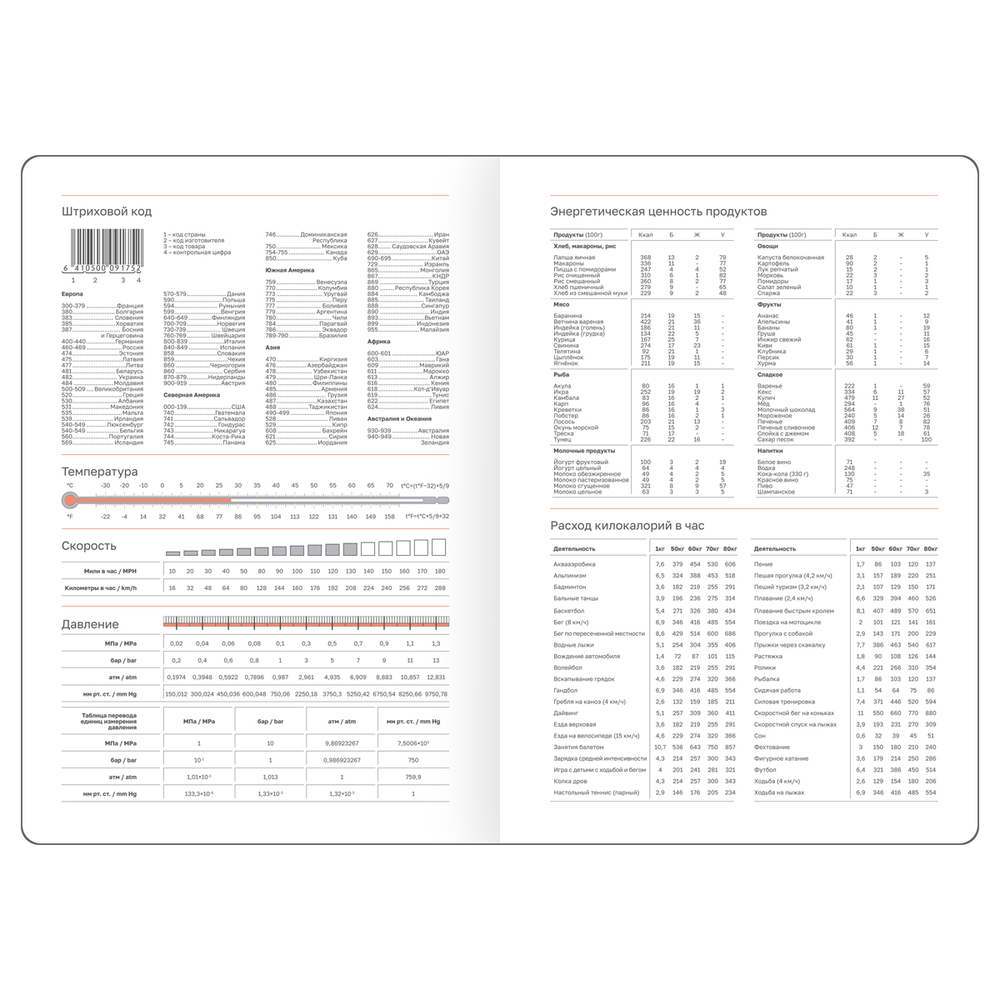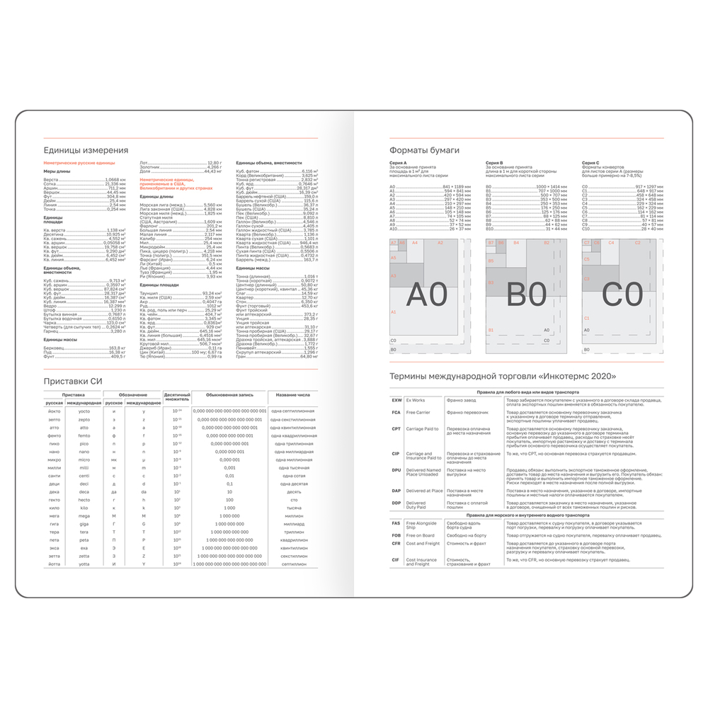В ежедневнике предусмотрена справочная информация, таблицы, календарь на 4 года и другие полезные сведения.