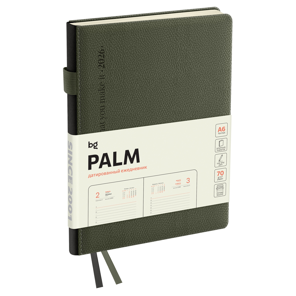 Ежедневник датированный на 2026 год BG серии "Palm" – идеальный компаньон для стильной и организованной жизни. Пухлая обложка с мягкой прослойкой выполнена из экокожи. Корешок в тон и мотивирующая фраза, нанесённая с помощью тиснения, придают стиль.