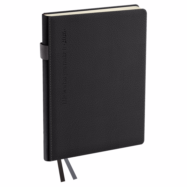 Две закладки-ляссе позволят быстро и легко найти нужную страницу, что делает навигацию по ежедневнику удобной и эффективной. Специальная петля из прочной резинки в цвет обложки подойдёт для фиксации ручек.
