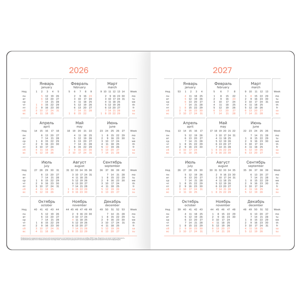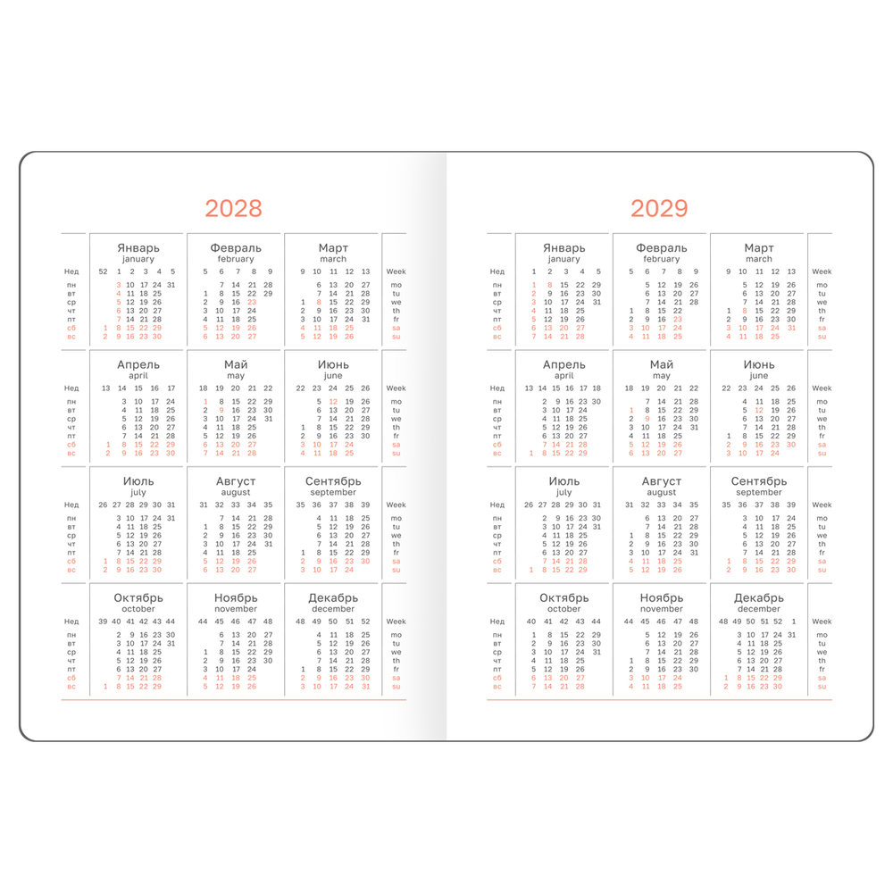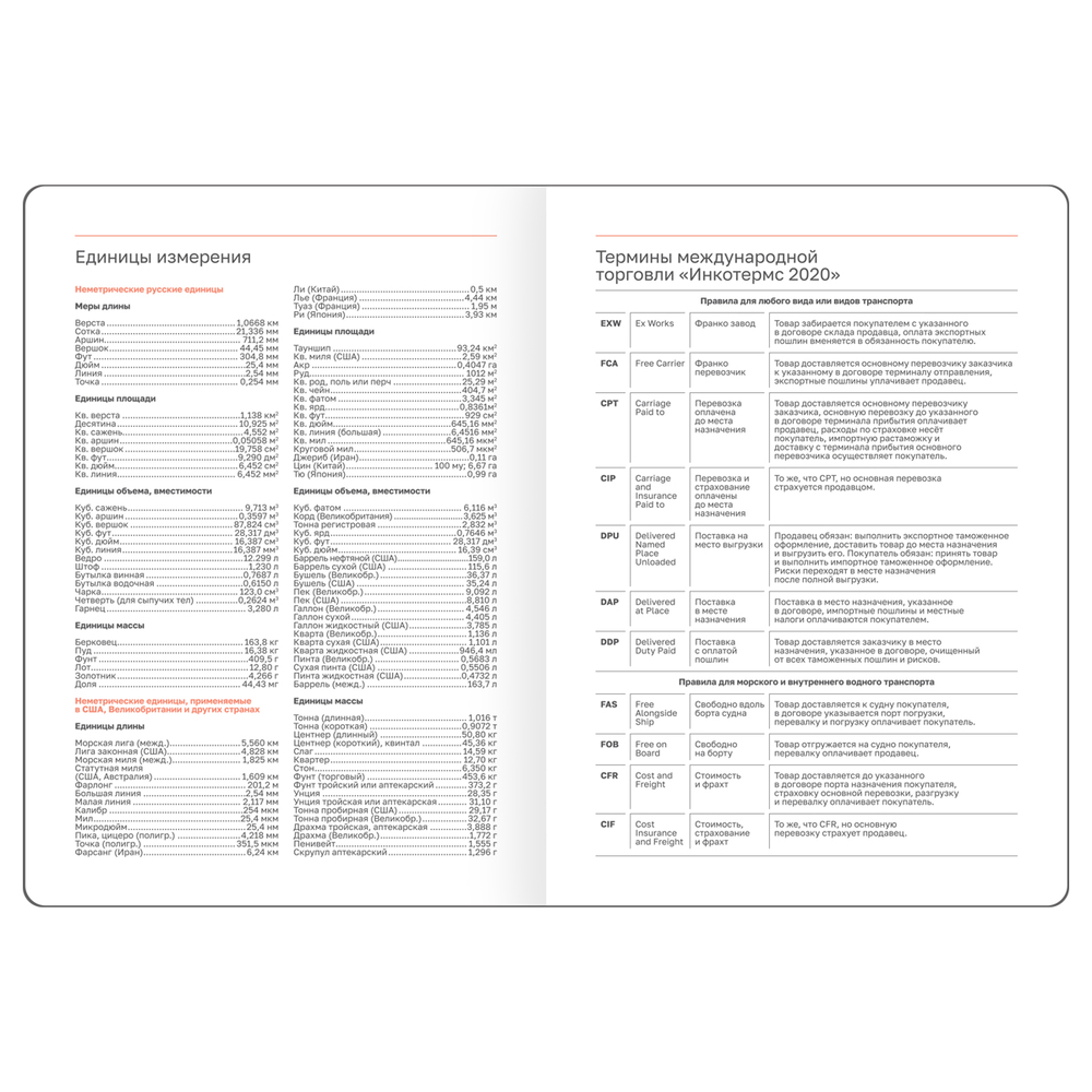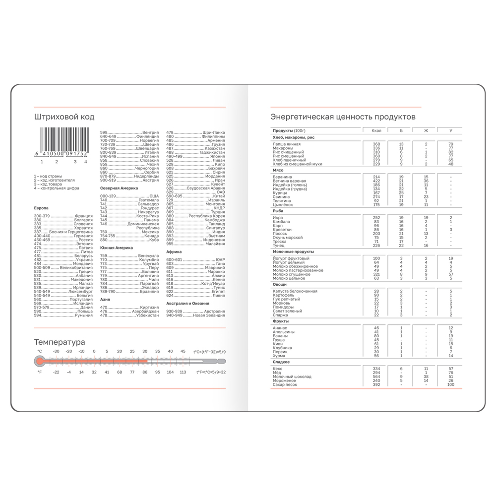В ежедневнике предусмотрена справочная информация, таблицы, календарь на 4 года и другие полезные сведения.