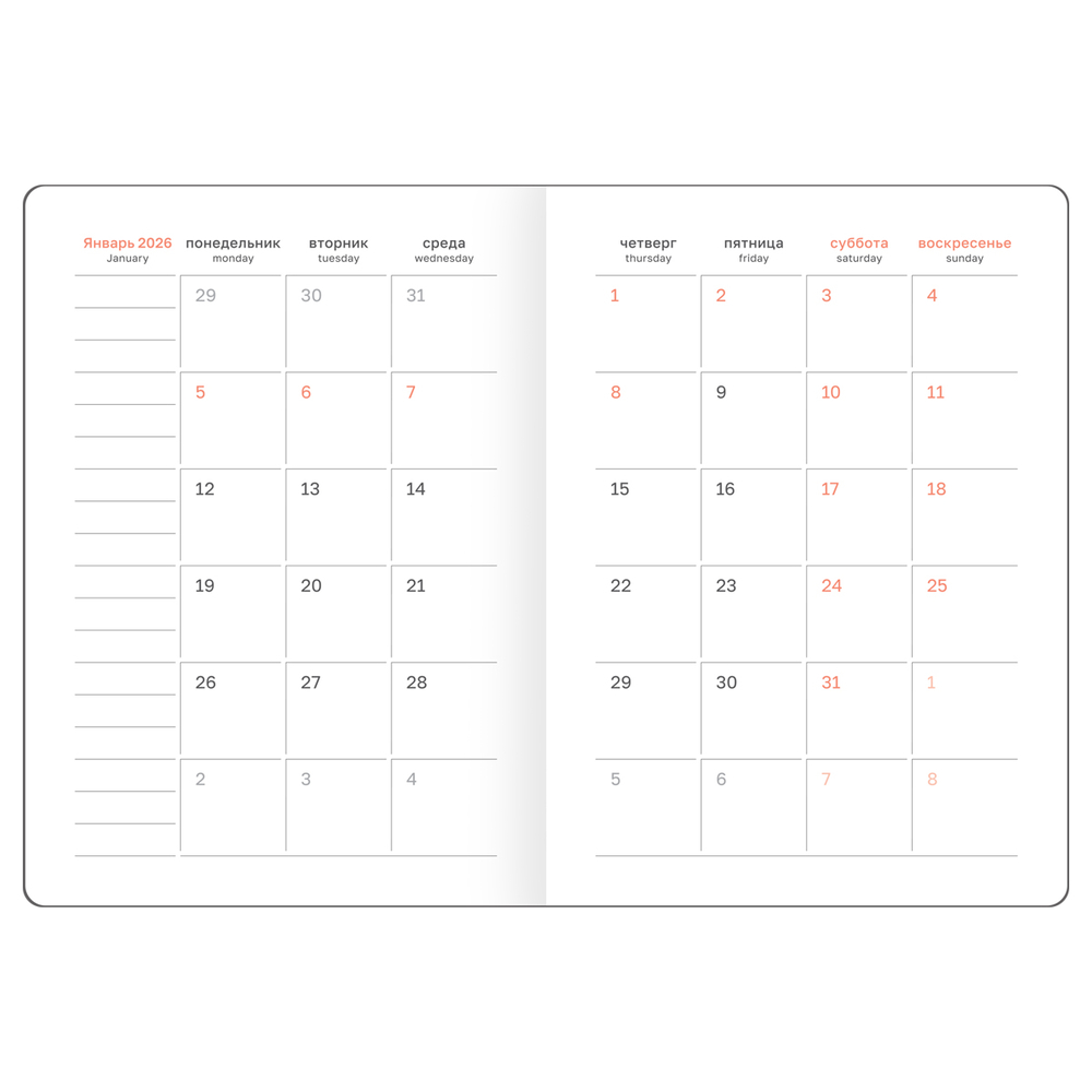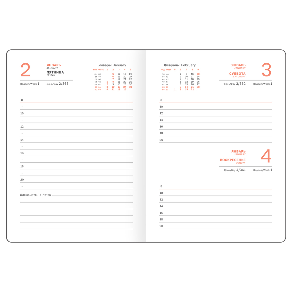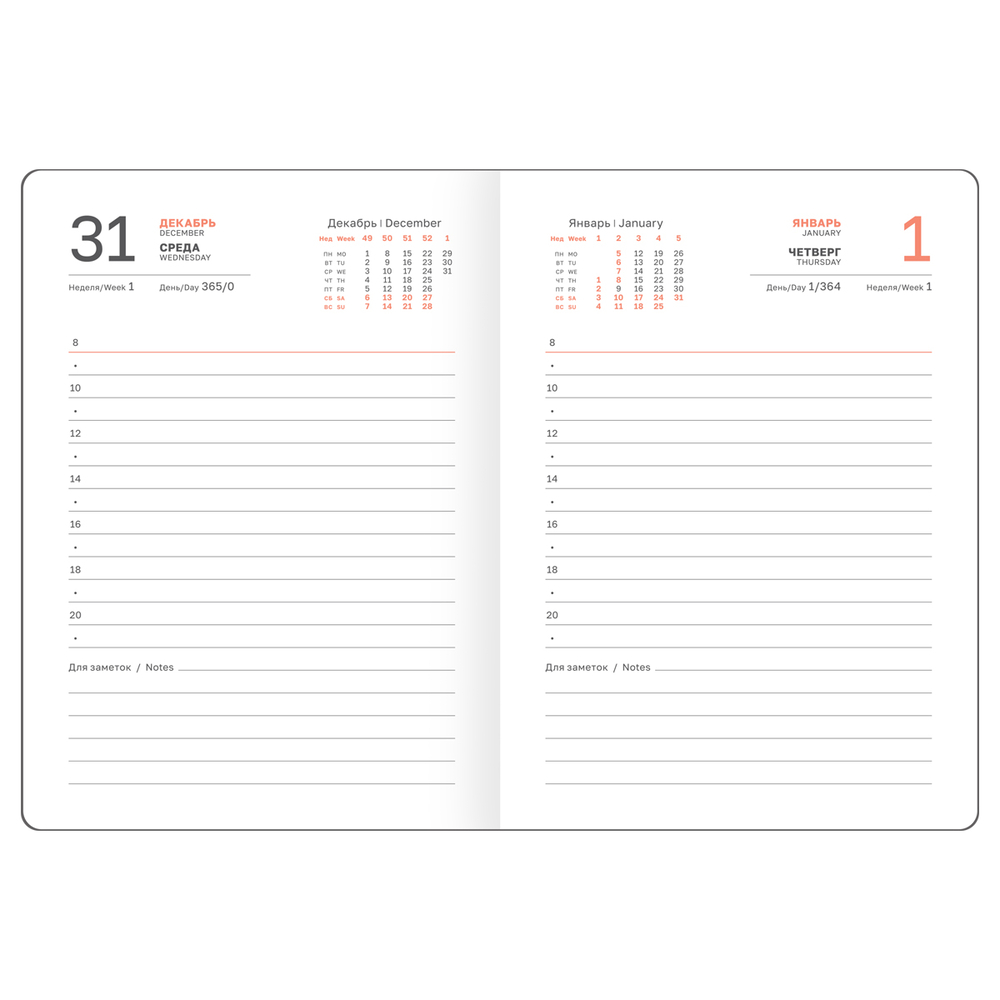 Внутренний блок состоит из 176 листов белой офсетной бумаги плотностью 70 г/м2 с печатью в 2 краски. Датированный ежедневник представлен в размере 105х145 мм.