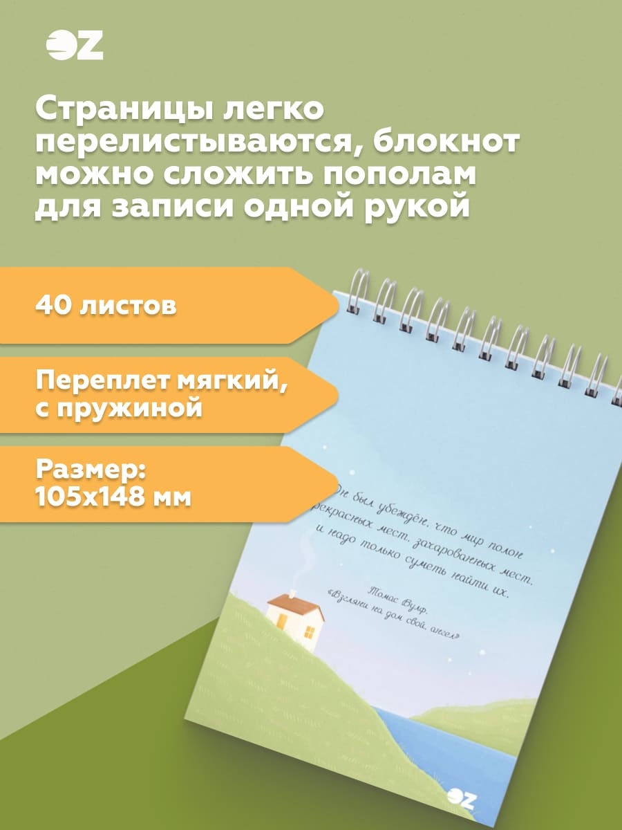Списки дел и покупок, удачные шутки, адреса и телефоны, – в фирменном блокноте OZ удобно делать записи даже на ходу. Он легко помещается в сумочку или карман благодаря небольшому размеру – с четвертинку листа А4. В блокноте 40 листов, переплет мягкий, с пружиной.