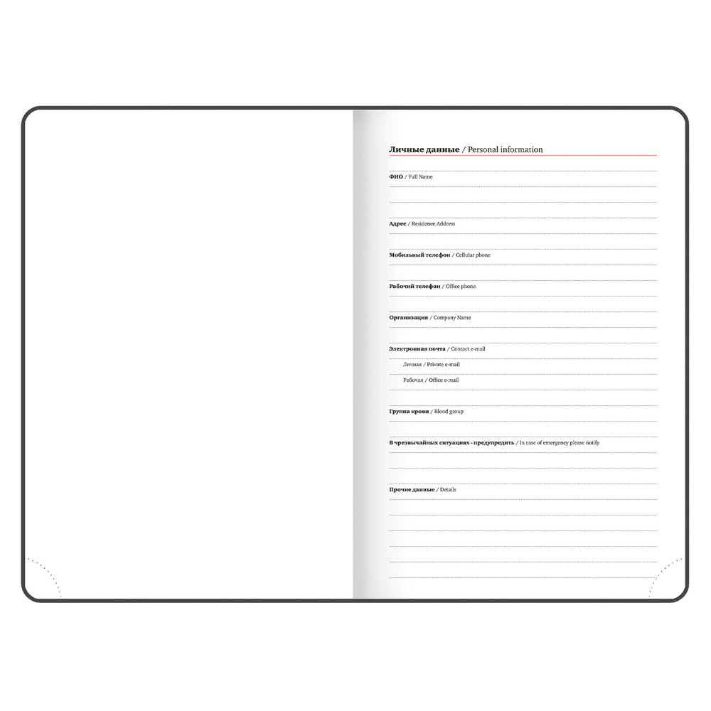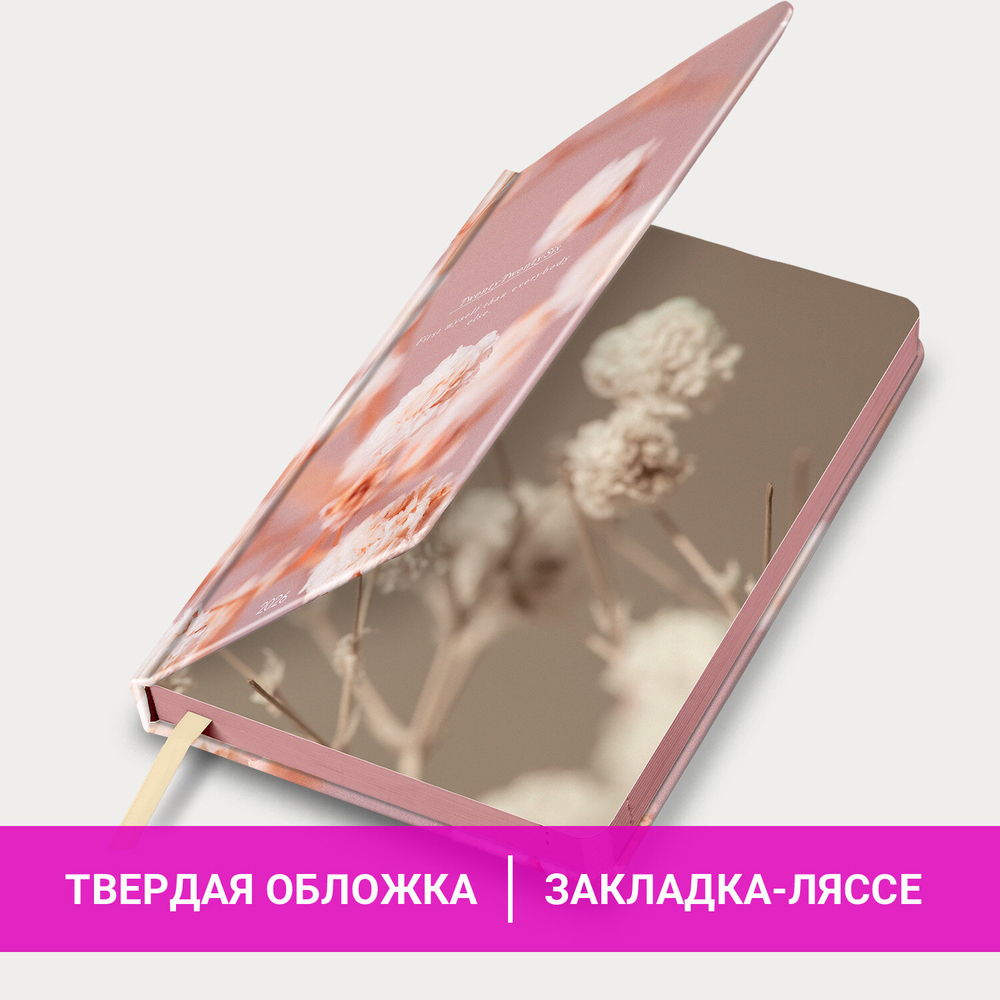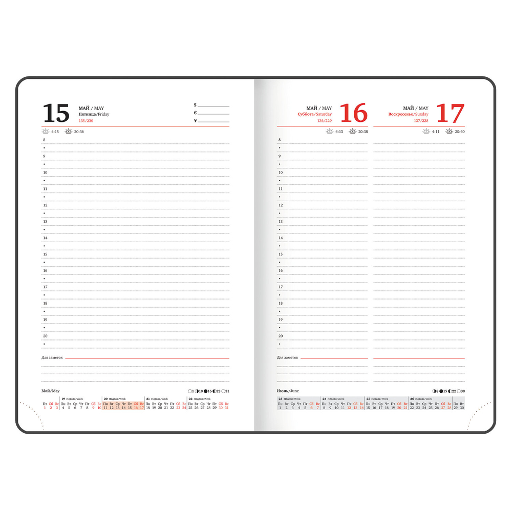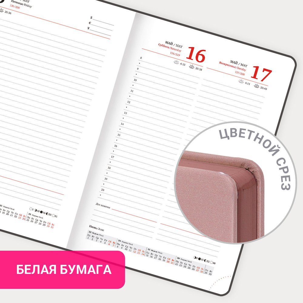 Внутренний блок включает 168 листов белой бумаги плотностью 70 г/м2. Каждая страничка имеет перфорированный угол. Благодаря стандартному формату А5 (138х213 мм) ежедневник удобно использовать как в офисе, так и на выездных деловых встречах.