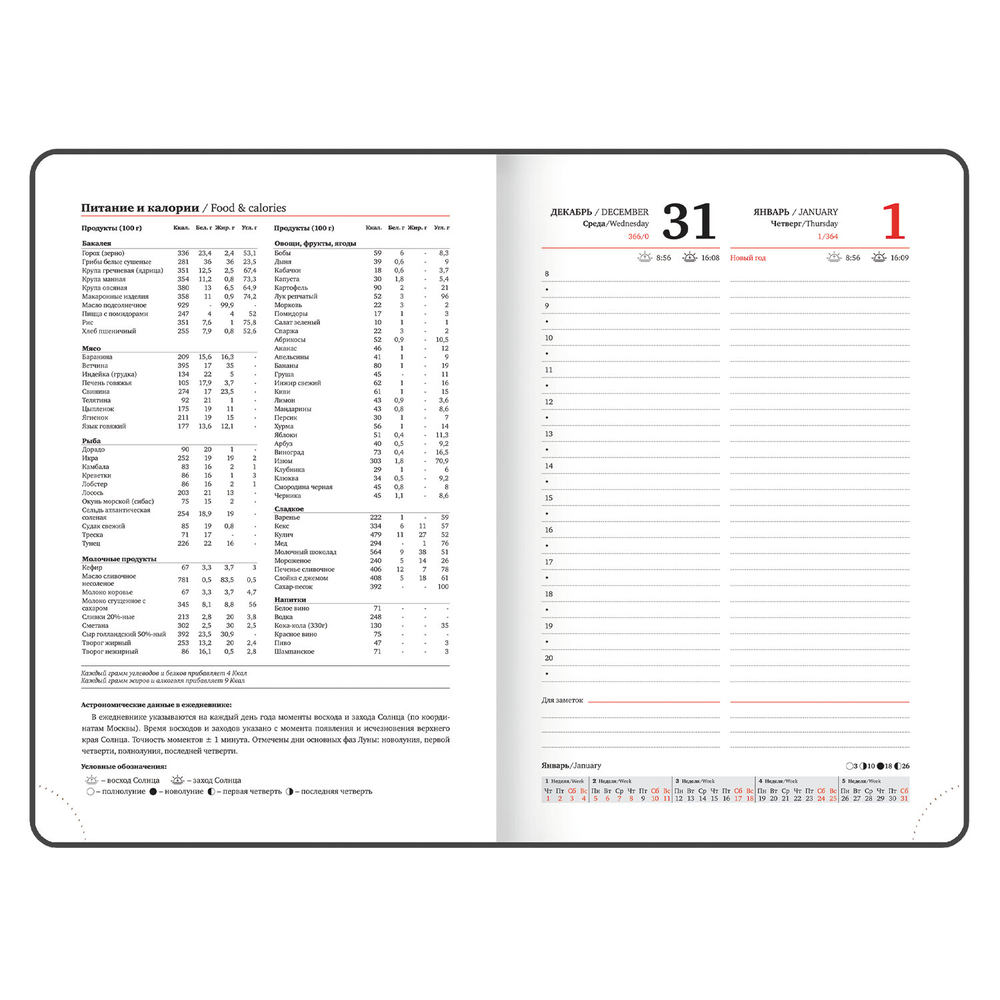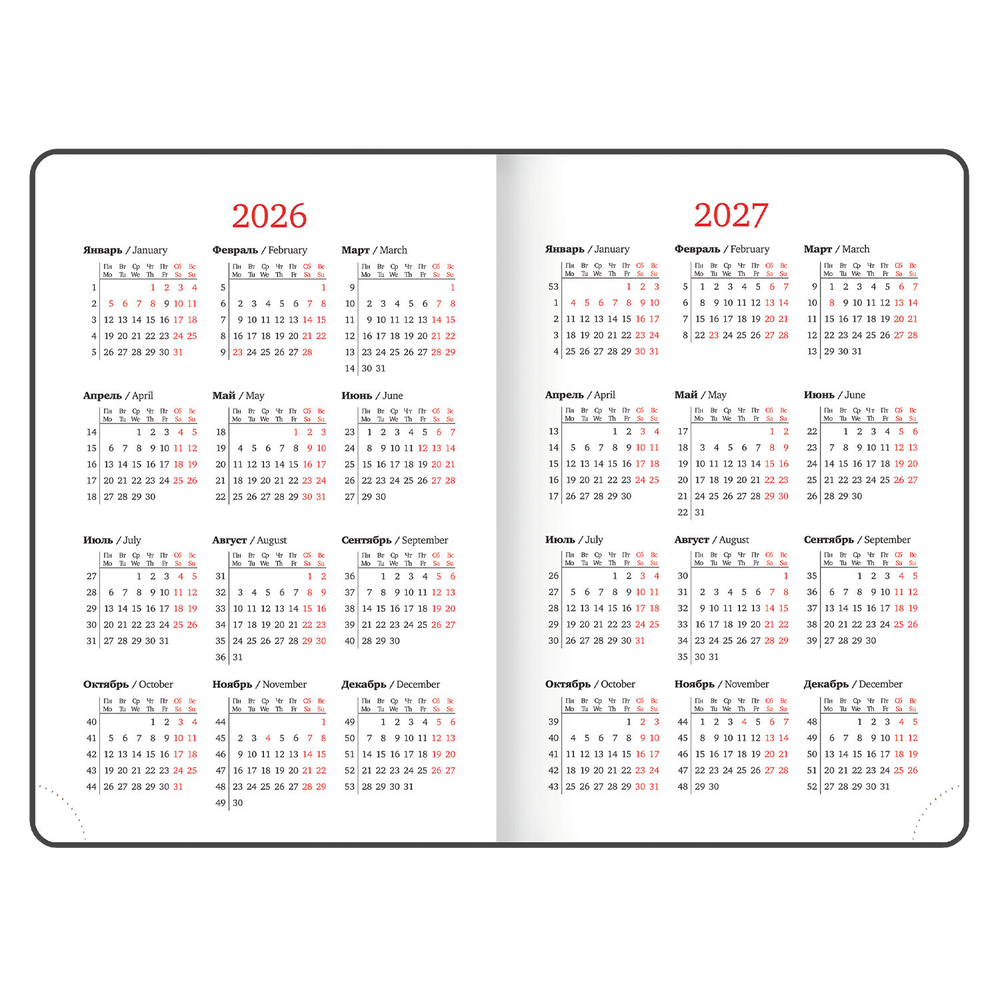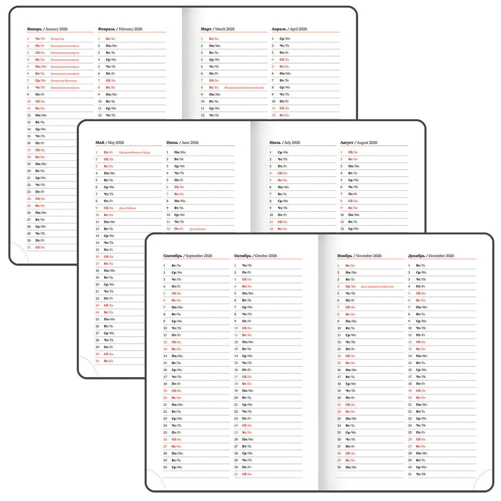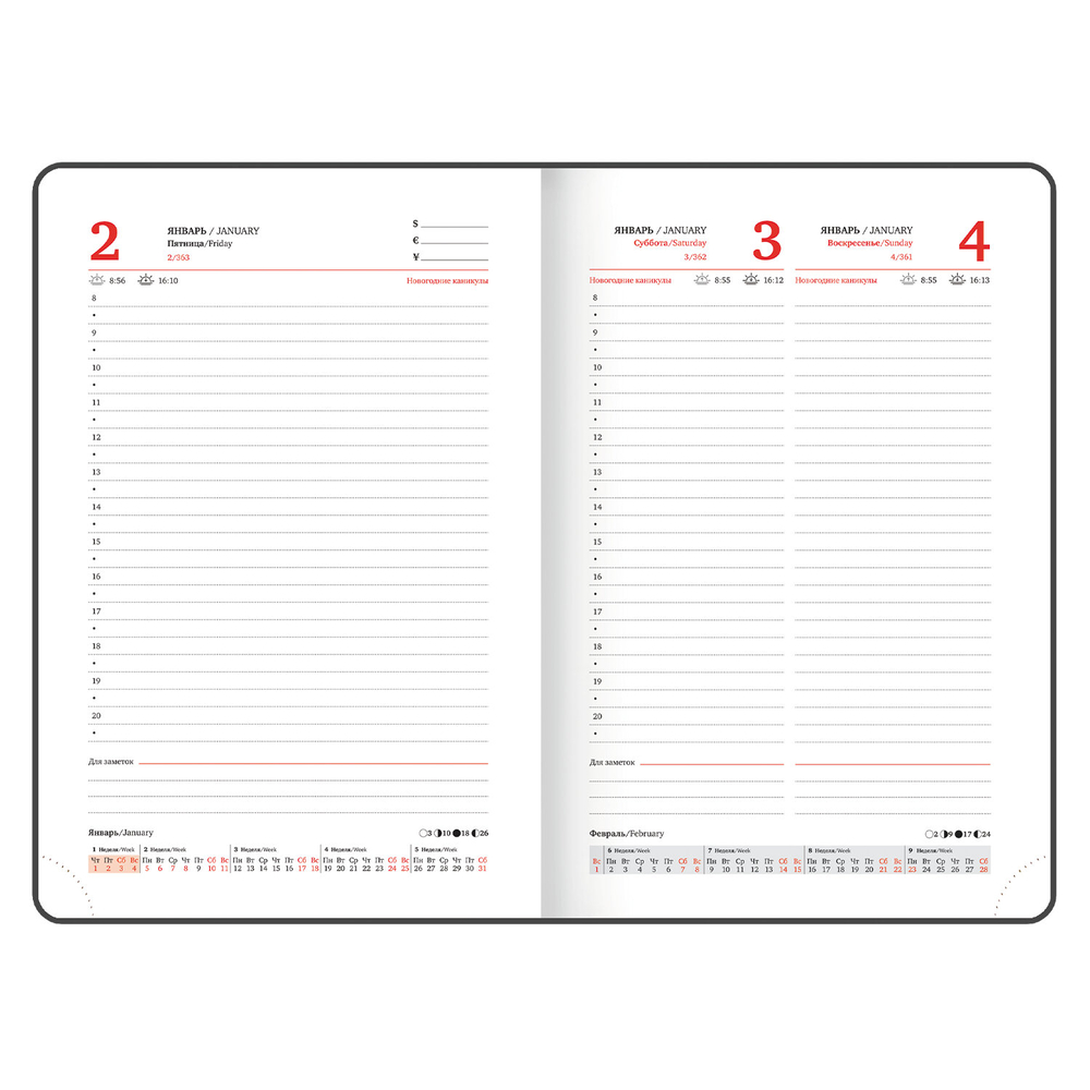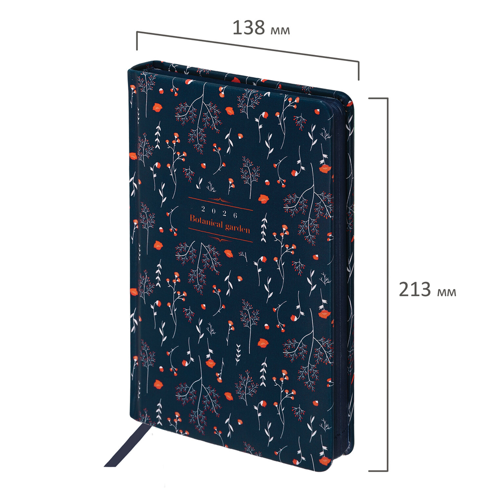 Внутренний блок включает 168 листов белой бумаги плотностью 70 г/м2. Каждая страничка имеет перфорированный угол. Благодаря стандартному формату А5 (138х213 мм) ежедневник удобно использовать как в офисе, так и на выездных деловых встречах.