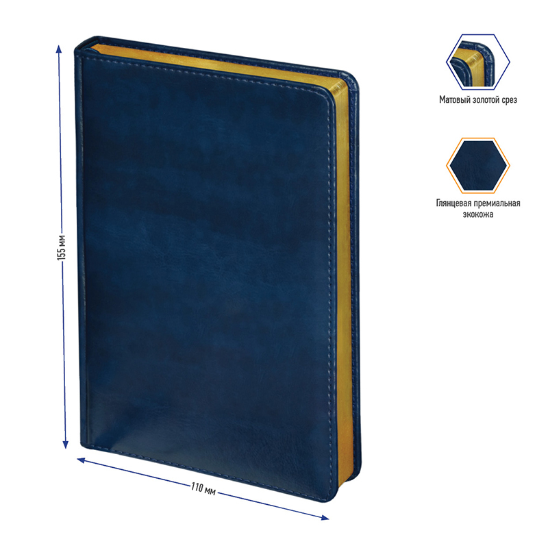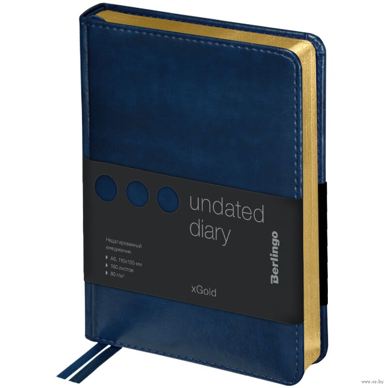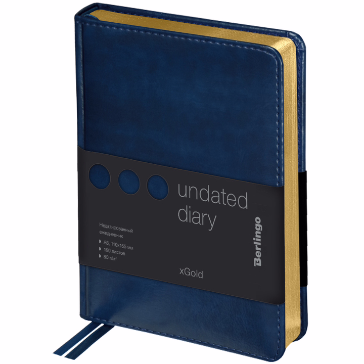 Золотой фольгированный срез красиво подчеркивает глубокий синий цвет обложки. Внутренний блок состоит из 160 листов высококачественной кремовой бумаги повышенной плотности 80 г/м² с пантонной печатью в 2 краски. Размер недатированного ежедневника – 110 на 155 мм. Перфорированные уголки листов и 2 закладки-ляссе сделают использование ежедневника Berlingo "xGold" комфортным.