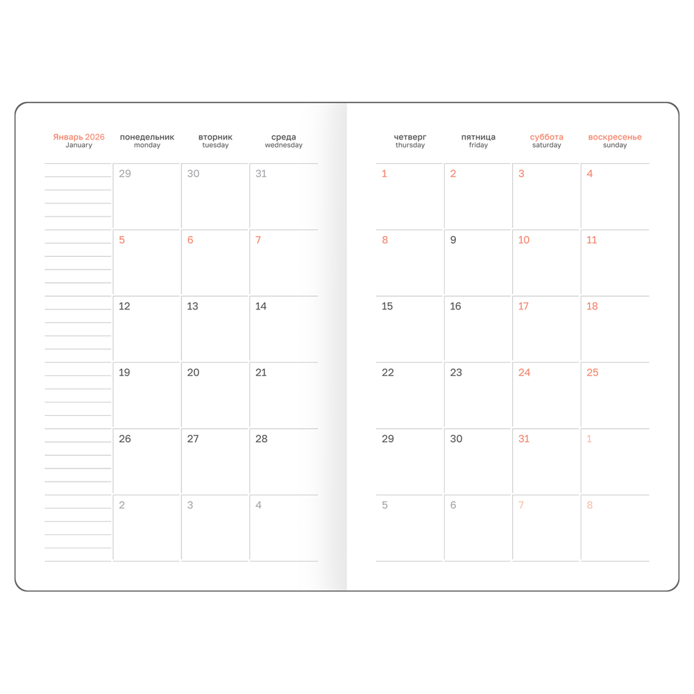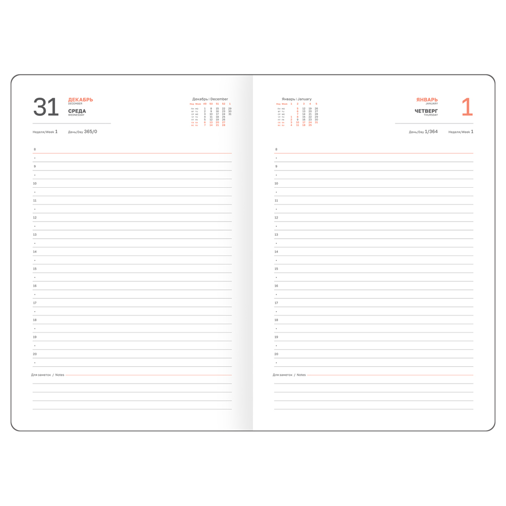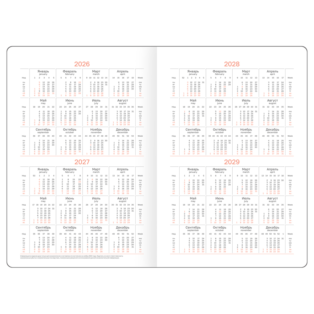 Перфорированные уголки и две закладки-ляссе обеспечат комфорт и удобство при использовании. В ежедневнике предусмотрена справочная информация, годовой планер, календарь и другие полезные сведения. Резинка не позволит ежедневнику неожиданно открыться. Подходит под персонализацию.