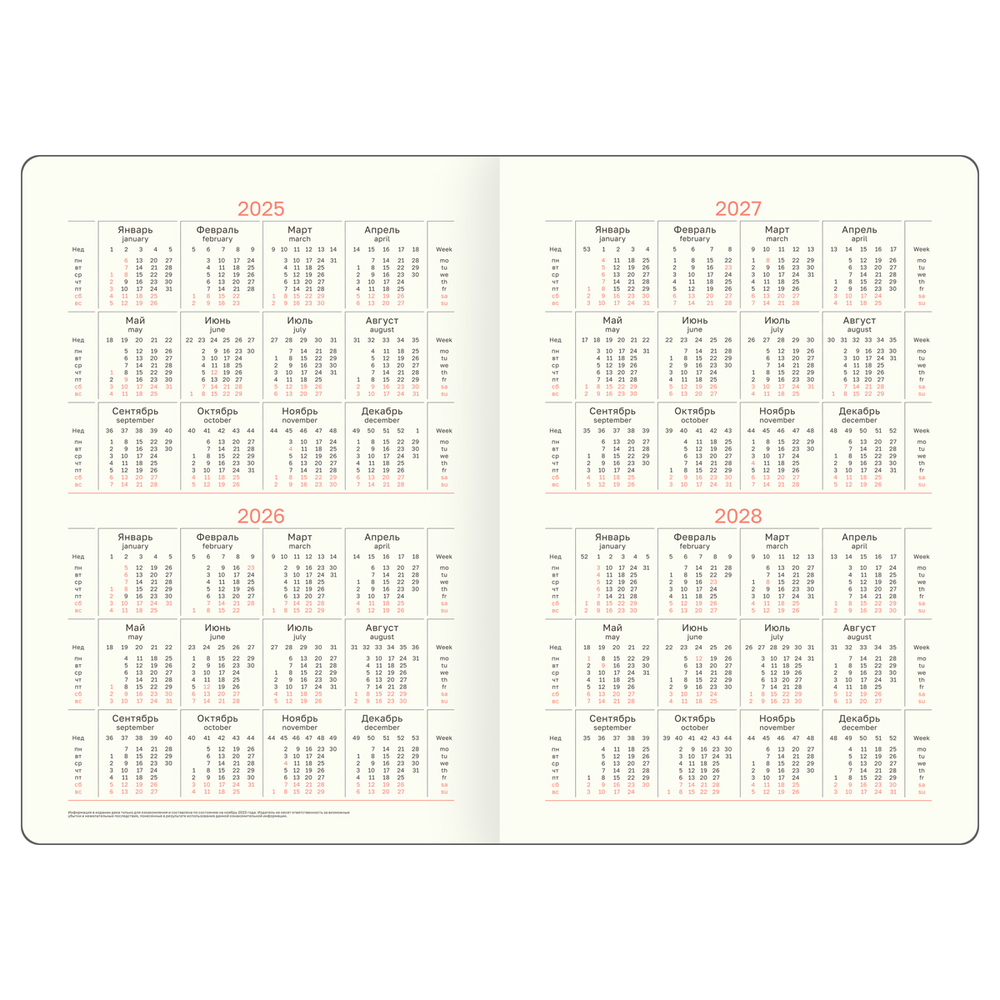 В ежедневнике предусмотрена справочная информация, годовой планер, календарь и другие полезные сведения. Подходит под персонализацию.