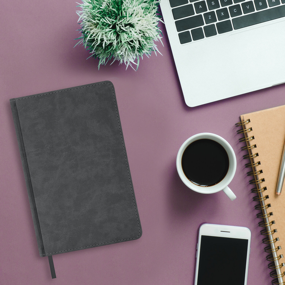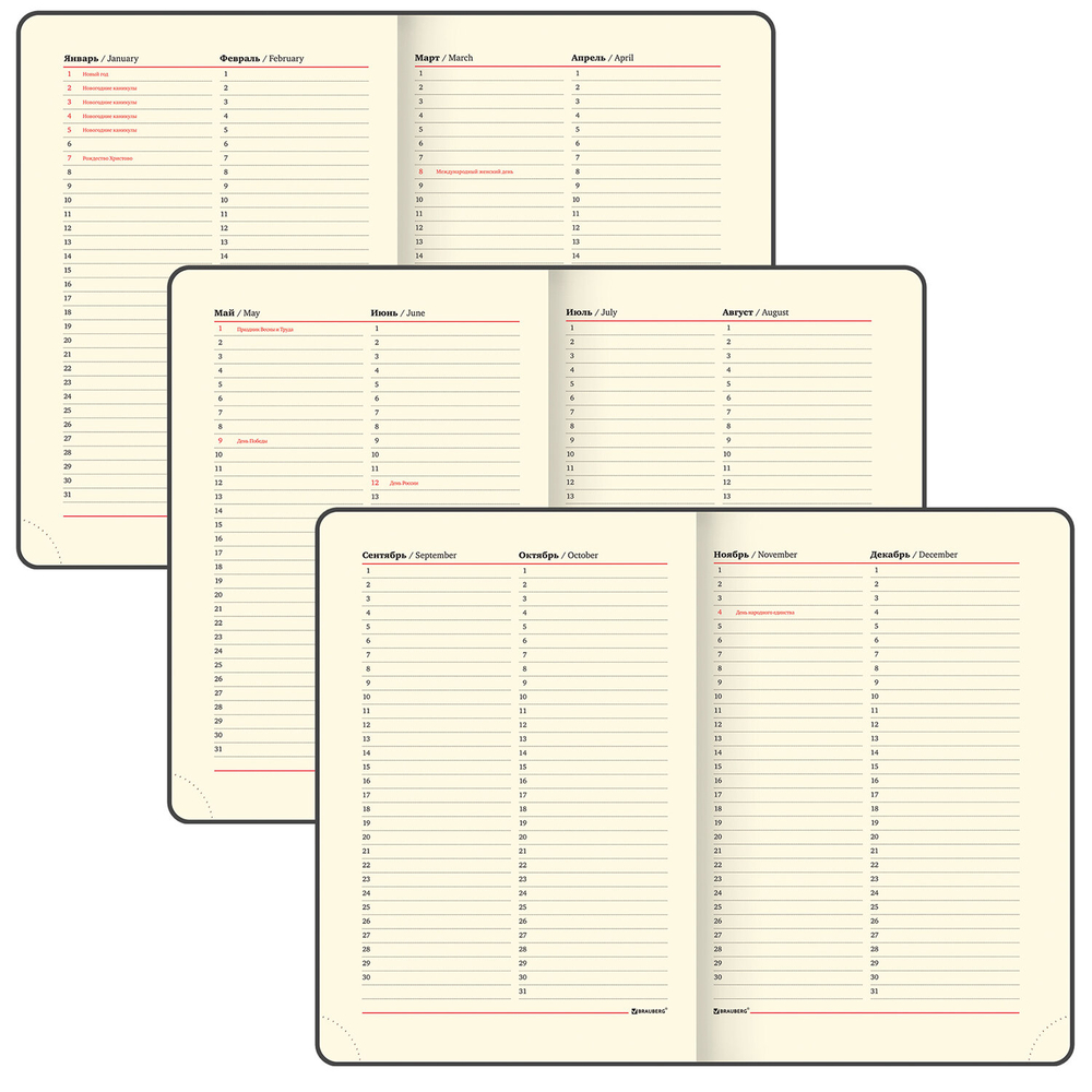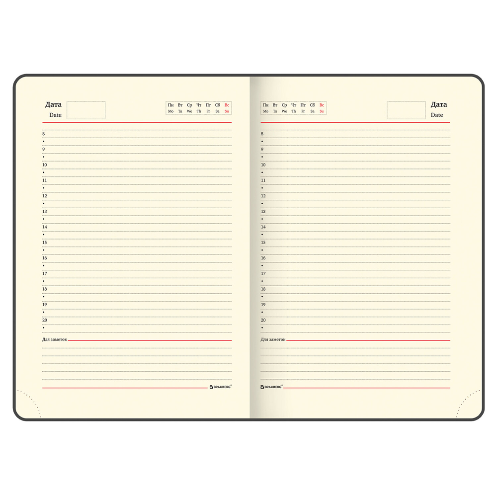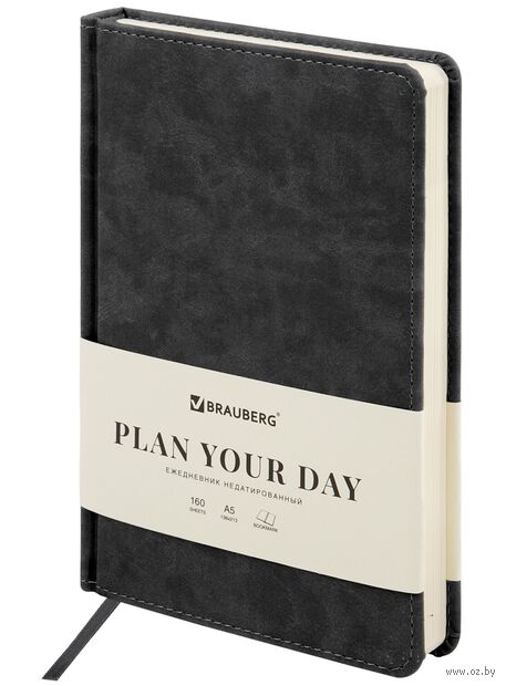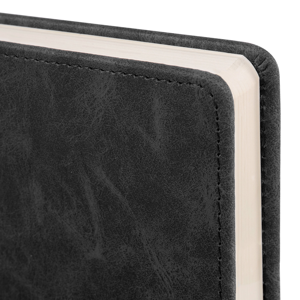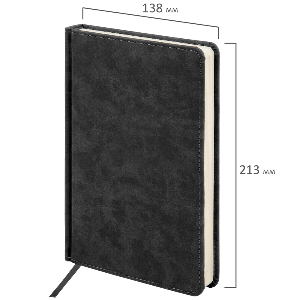 Внутренний блок включает 160 листов тонированной бумаги плотностью 70 г/м2. Каждая страничка имеет перфорированный угол. Благодаря стандартному формату А5 (138х213 мм) ежедневник удобно использовать как в офисе, так и на выездных деловых встречах. Твердая обложка стилизована под фактурную кожу. Подходит для горячего тиснения.