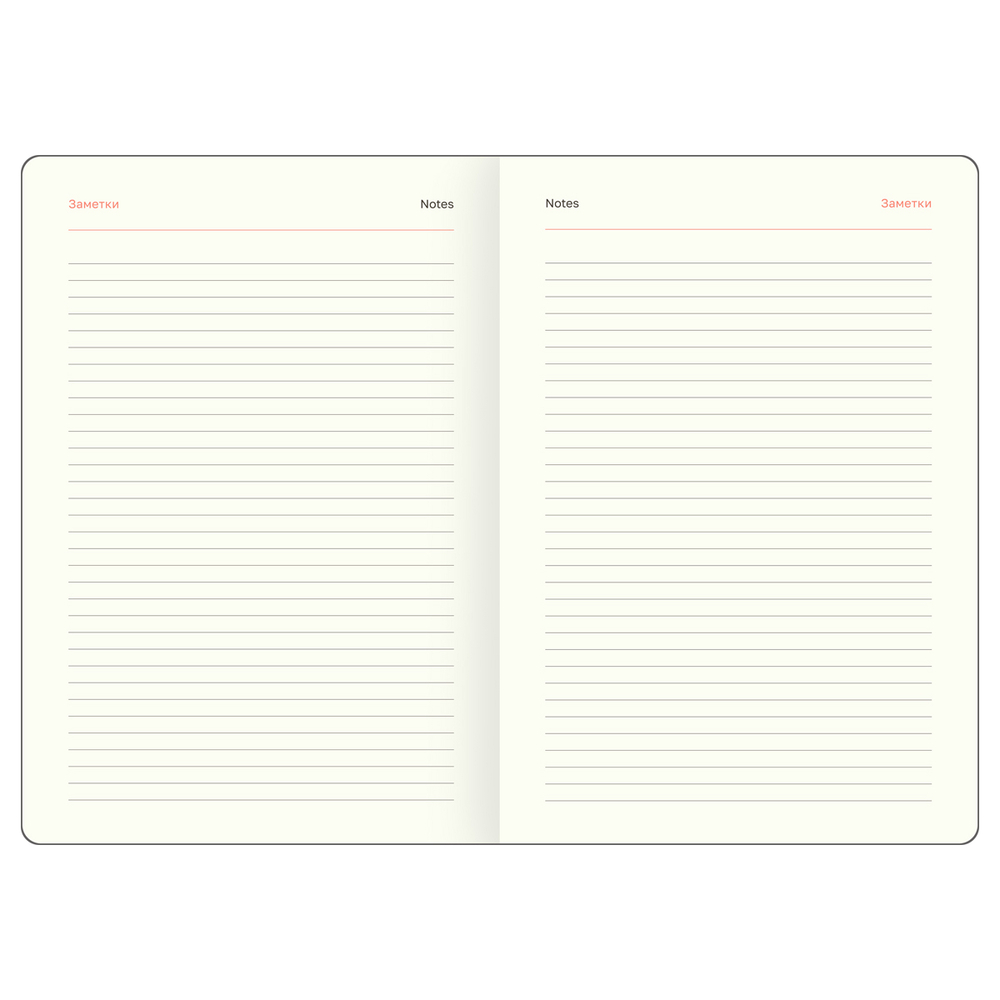Формат – А5 (145х205 мм). Изделие состоит из 136 листов тонированной бумаги плотностью 70 г/м2, которая подходит для любых типов ручек и не будет просвечиваться. В линованный блок с полем для даты и планингом удобно записывать встречи, идеи и задачи. Уголки листов с перфорацией.
