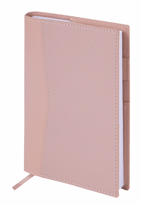 Гибкая съемная обложка стилизована под текстурную кожу. Материал обложки подходит для горячего тиснения. Дополнениями являются закладка-ляссе, с помощью которой при необходимости можно быстро открыть ежедневник на нужной странице, и держатель для ручки. На обложке расположены несколько карманов для карт, визиток или купюр. Справочный материал дополнительно расширяет функциональность ежедневника. В конце внутреннего блока есть 7 страниц для записей и заметок.