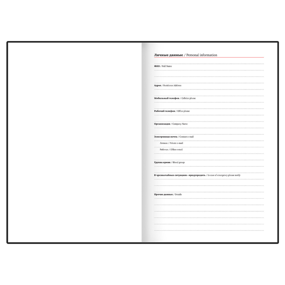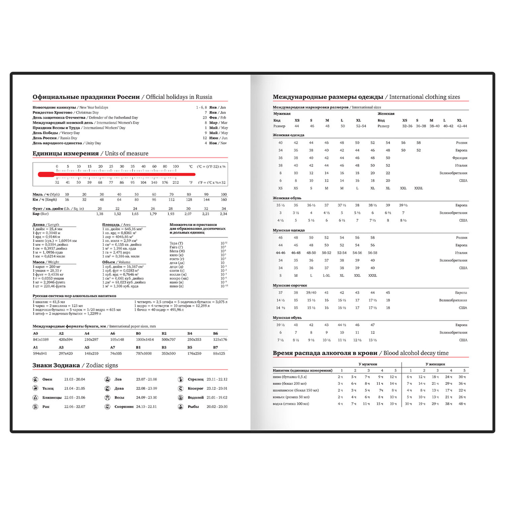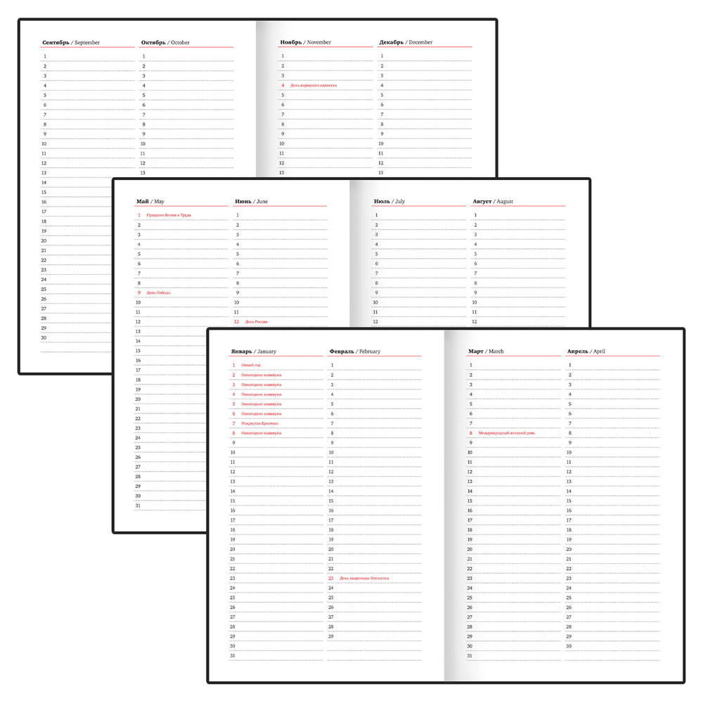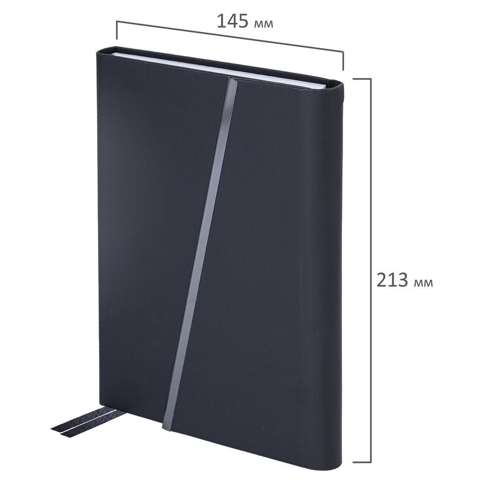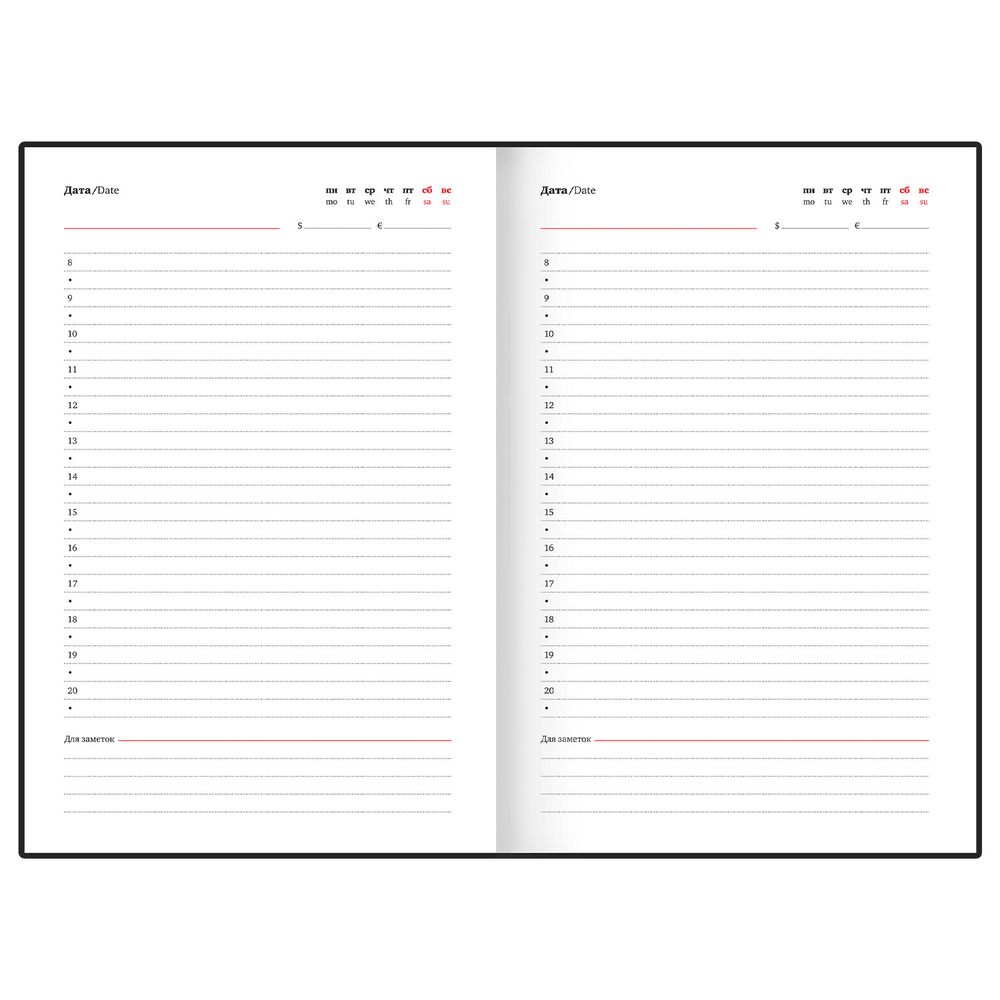 Внутренний блок включает 160 листов белой бумаги плотностью 70 г/м2. Каждая страничка имеет перфорированный угол. Благодаря стандартному формату А5 (145х213 мм) ежедневник удобно использовать как в офисе, так и на выездных деловых встречах.