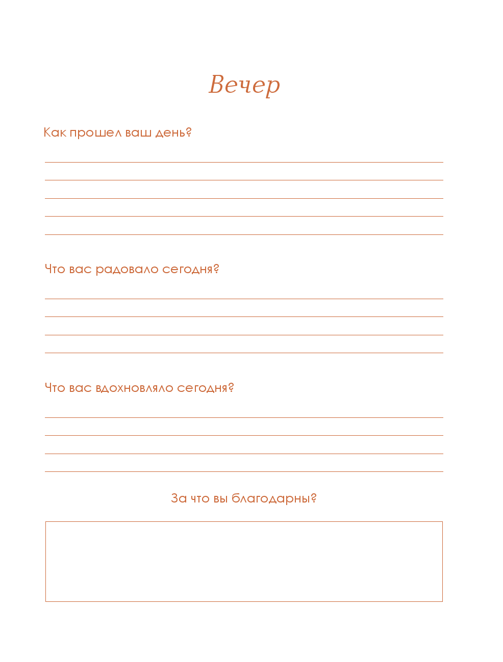 Маленькие ритуалы самоподдержки – основа гармоничной жизни. Каждый день находите время для маленьких ритуалов, которые наполняют вас энергией и спокойствием: чашка любимого чая, короткая прогулка, минута глубокого дыхания или страница ежедневника с искренними мыслями.