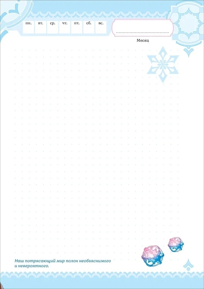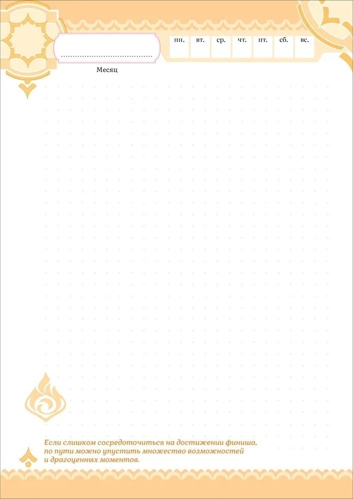 Блокнот дает полную свободу для самовыражения: страницы разлинованы в точку и содержат место для указания даты и дня недели. Мечтайте, рисуйте, планируйте важные дела, используйте наклейки, чтобы оформить мысли и идеи!