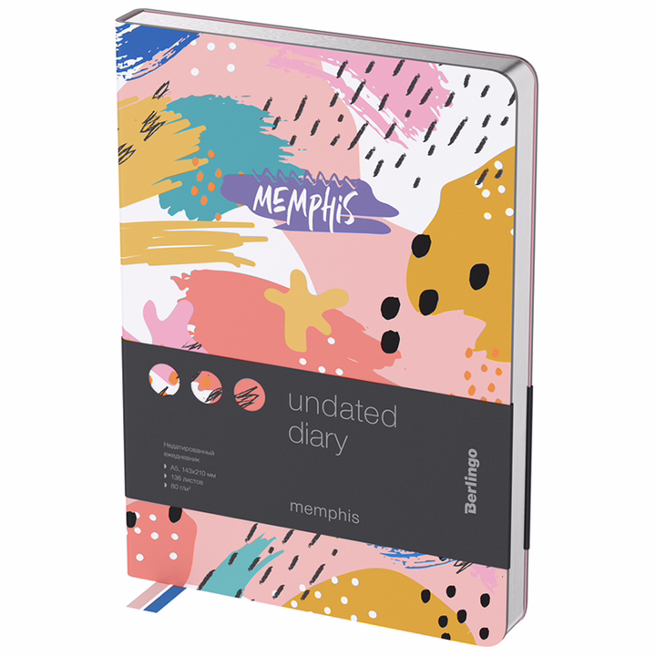 Стильный недатированный ежедневник Berlingo "Memphis" формата A5 с серебристым фольгированным контрастным срезом и ультрамягкой обложкой из высококачественной экокожи. Яркий дизайн коллекционной серии Berlingo Memphis. Внутренний блок состоит из 136 листов высококачественной кремовой бумаги повышенной плотности 80 г/м² с пантонной печатью в 2 краски.