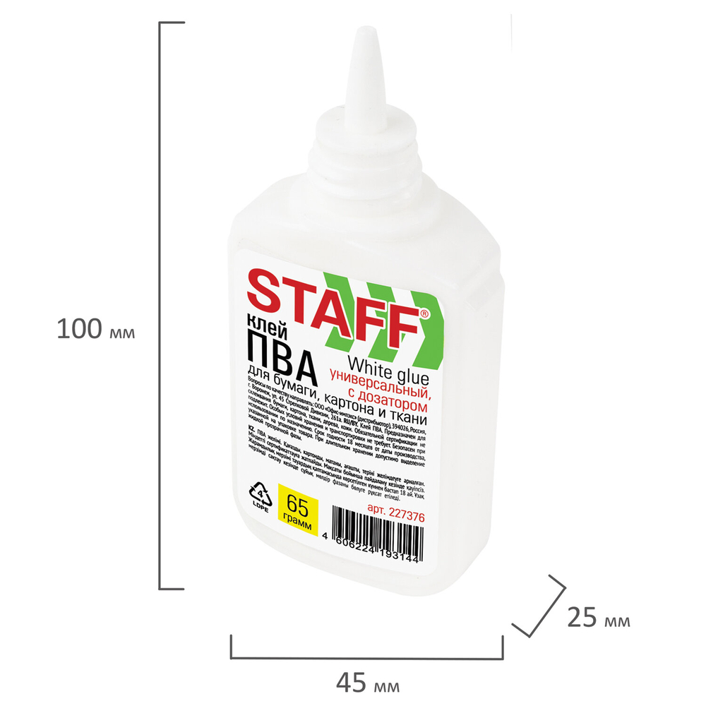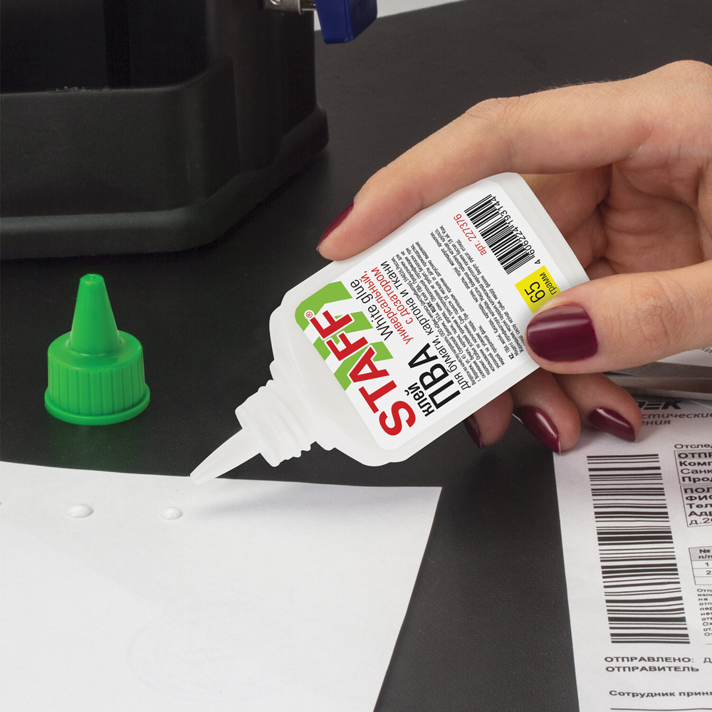 Имеет объем 65 мл. Флакон оснащен пластиковым дозатором, который позволяет равномерно и точно наносить клей на поверхность. Не токсичен, морозоустойчив. Быстрое склеивание достигается за счет нанесения тонкого слоя клея. Экономичное расходование. Съемный колпачок предохраняет клей от засыхания. Необходимо взболтать перед применением.