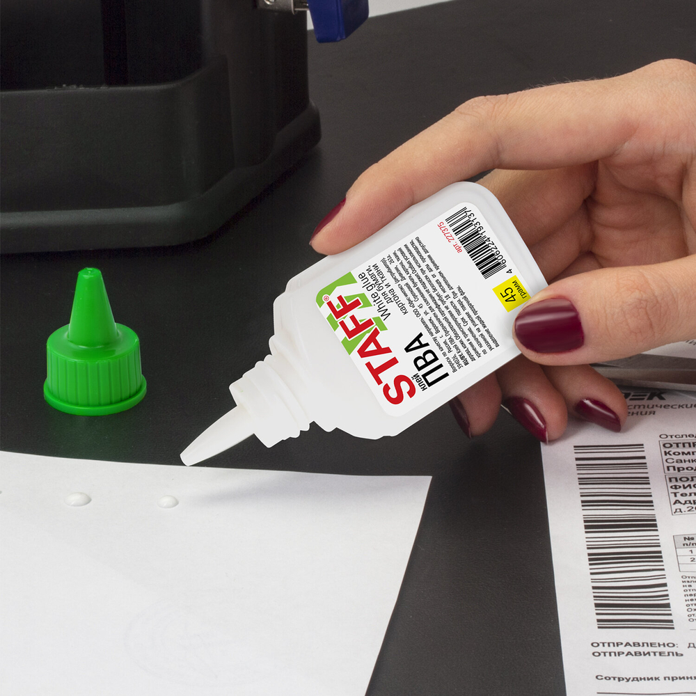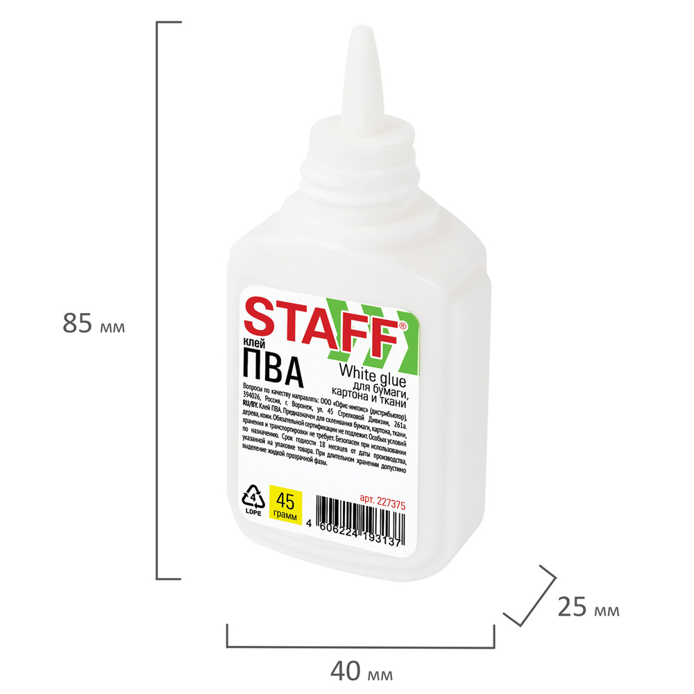 Имеет компактный объем 45 мл. Флакон оснащен пластиковым дозатором, который позволяет равномерно и точно наносить клей на поверхность. Не токсичен, морозоустойчив. Быстрое склеивание достигается за счет нанесения тонкого слоя клея. Экономичное расходование. Съемный колпачок предохраняет клей от засыхания. Необходимо взболтать перед применением.