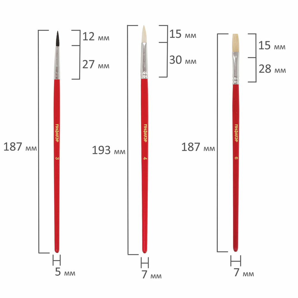 Белка: круглая № 3; коза: круглая № 4; щетина: плоская № 6.