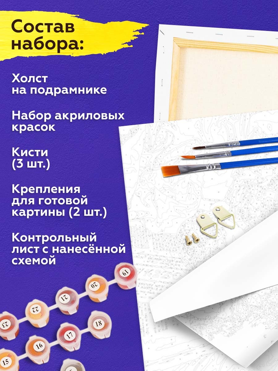 В набор входит холст с черно-белой цифровой разметкой. Каждой краске в наборе соответствует свой номер. Необходимо просто аккуратно нанести краски на участки с соответствующими цифрами. И так постепенно будет проявляться будущий шедевр.